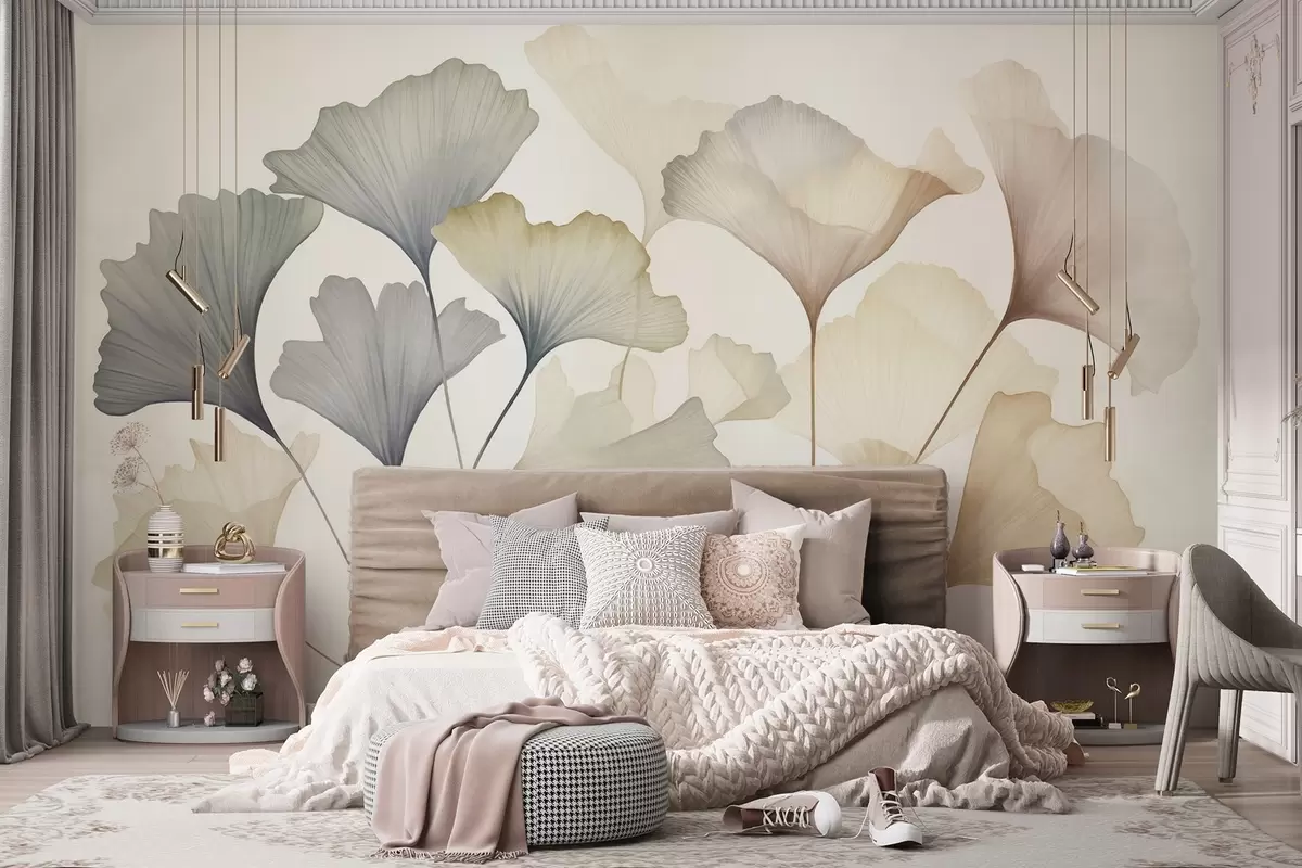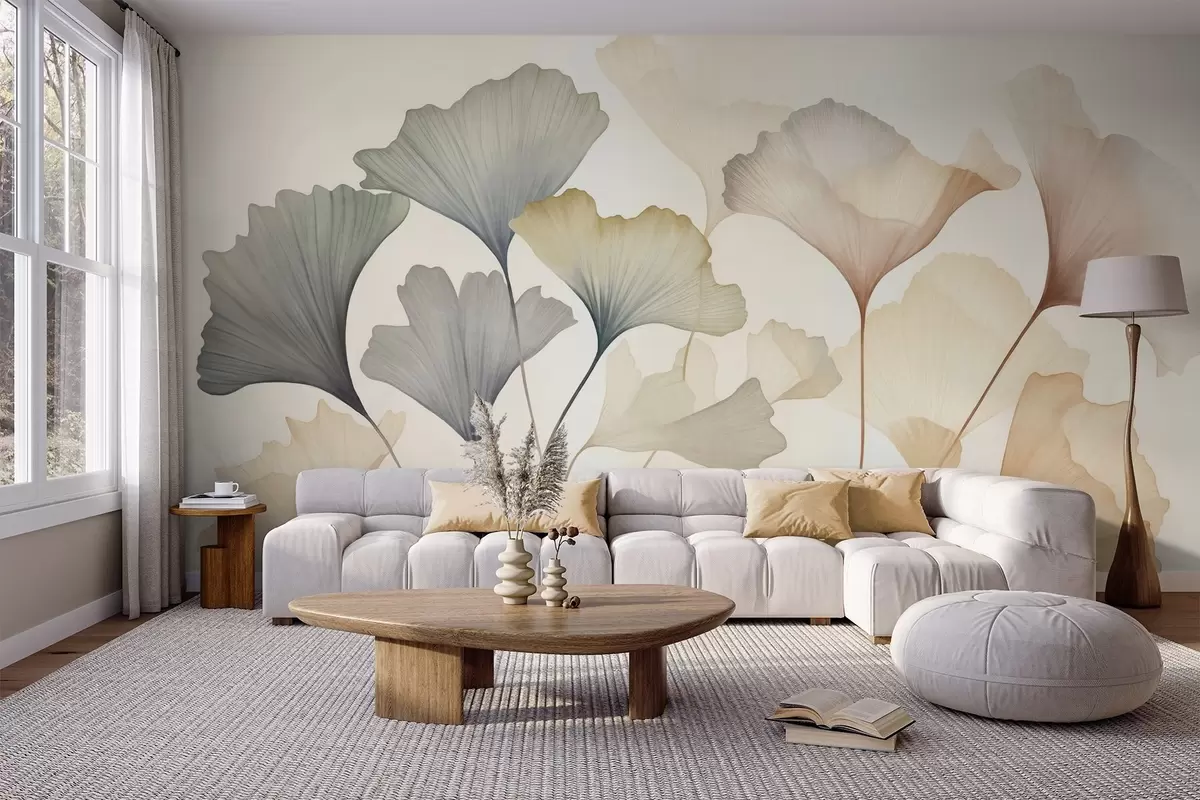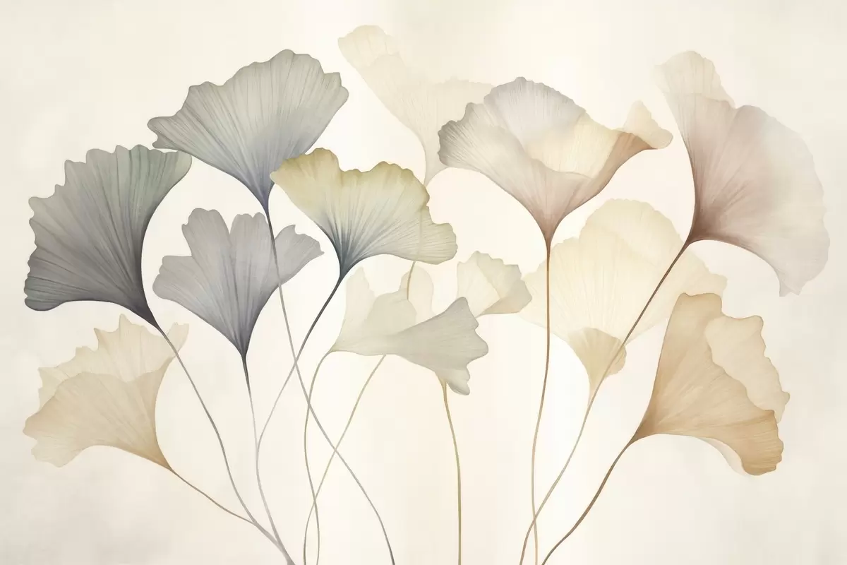 Carta da parati Foglie di ginkgo stilizzate in tenui tonalità pastello come il blu, il verde e il pesca, opera d'arte con texture nr. w09810