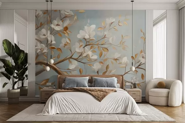 Carta da parati Ramo d'albero con texture, fiori bianchi e foglie gialle, in stile vintage nr. w09814