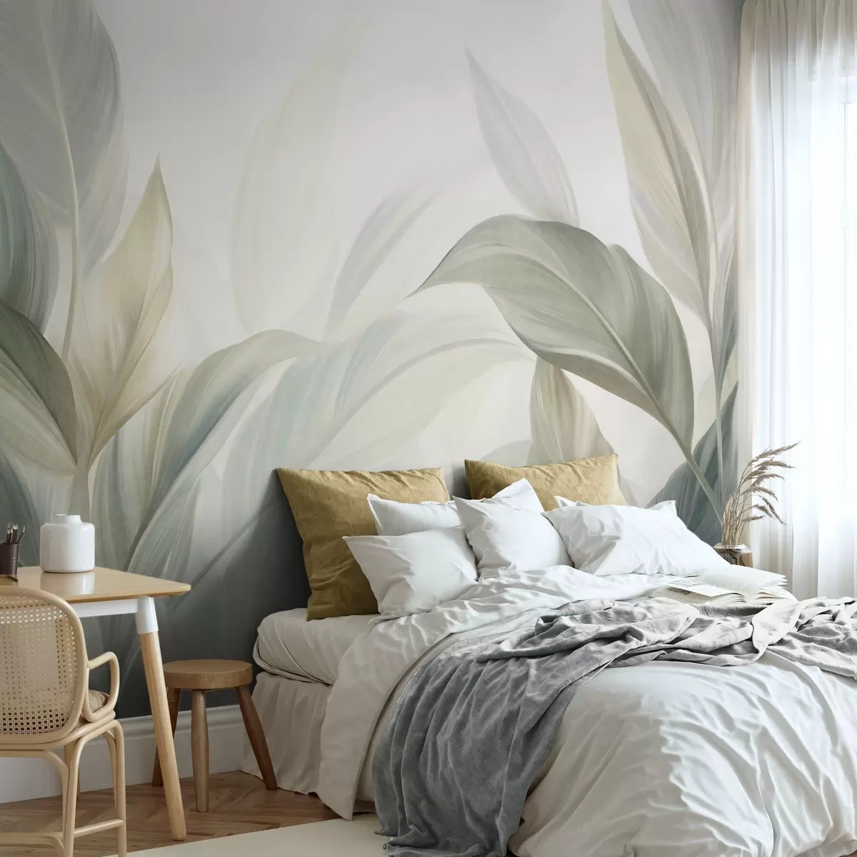 Carta da parati Grandi foglie tropicali di colore verde chiaro con tonalità tenui e pastello, in una composizione artistica ricca di texture nr. w09816