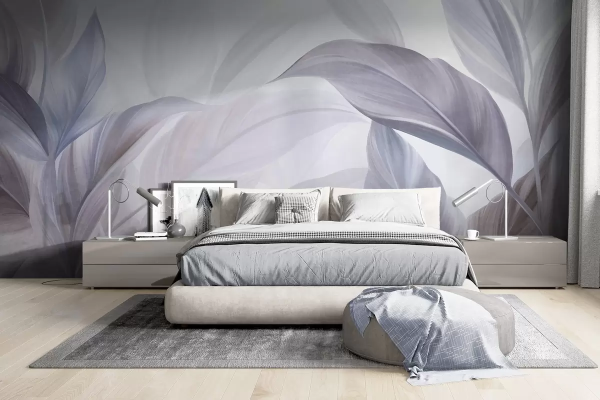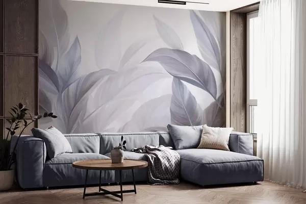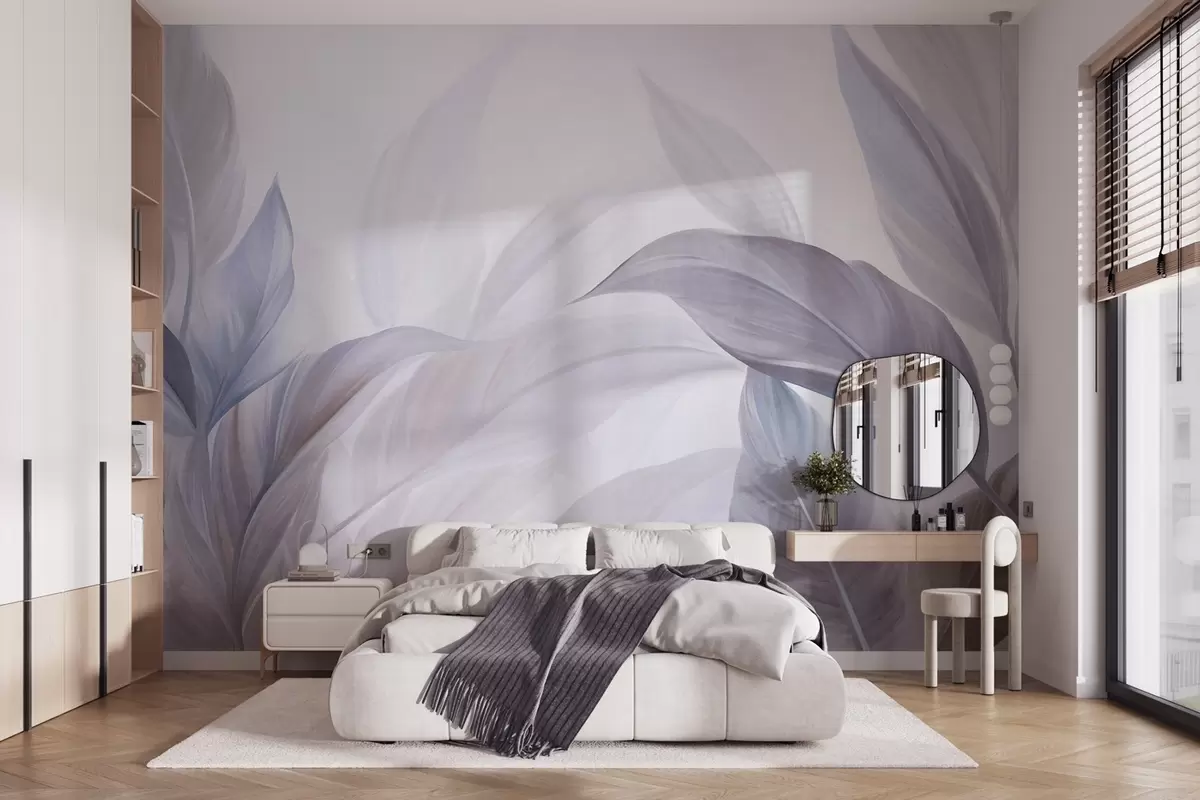 Carta da parati Grandi foglie tropicali dai toni del blu chiaro e del viola, con colori tenui e pastello, in uno stile artistico materico nr. w09816v1