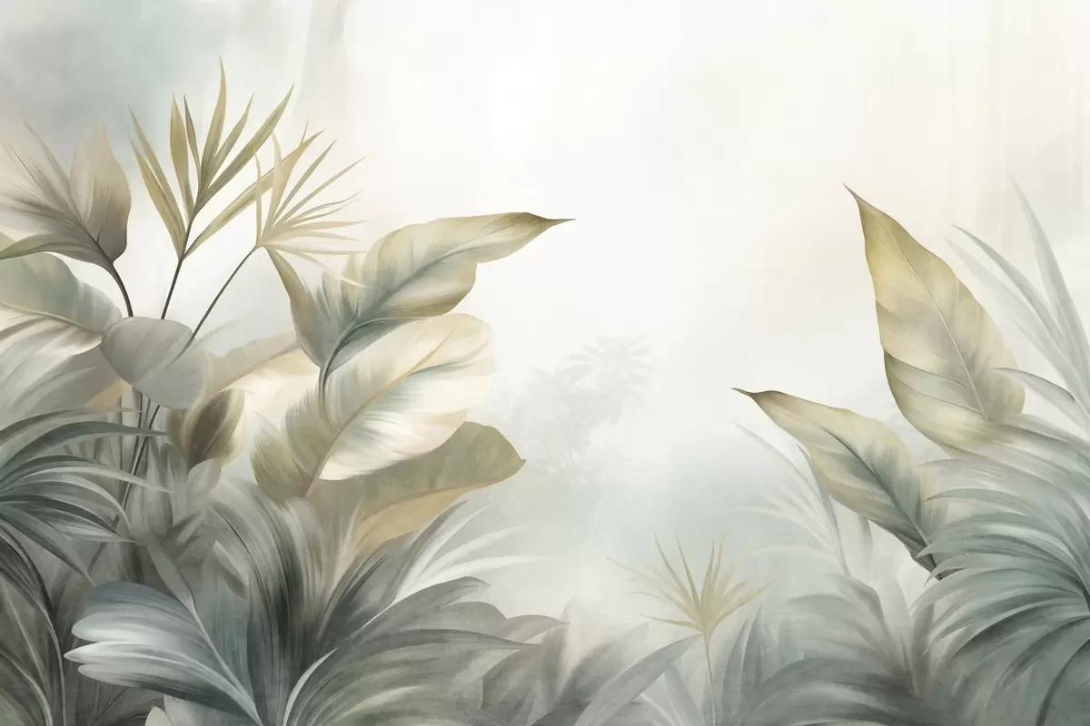 Carta da parati Grandi foglie tropicali dalla trama marcata, nei toni tenui del verde e del beige, in un ambiente da giungla nr. w09820