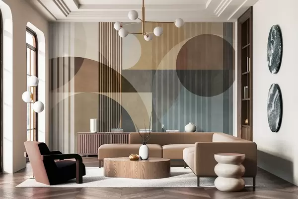 Carta da parati Forme geometriche astratte composte da cerchi e linee, tonalità tenui della terra, composizione ricca di texture e stratificata nr. w09834