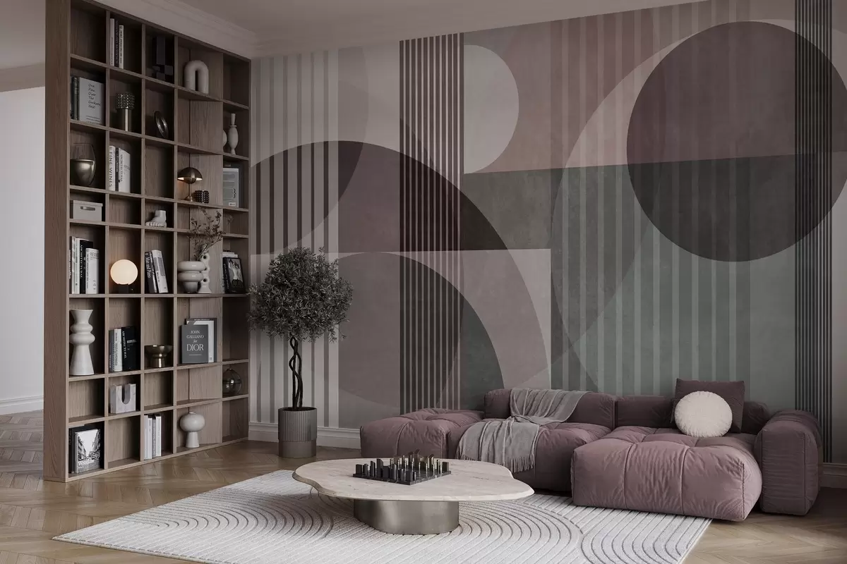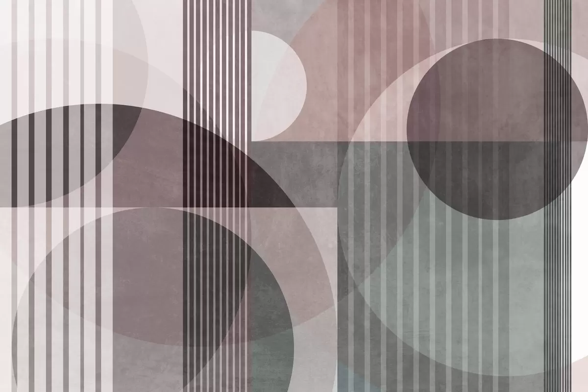 Carta da parati Forme geometriche astratte composte da cerchi e linee, tonalità tenui, composizione ricca di texture e stratificata nr. w09834v1