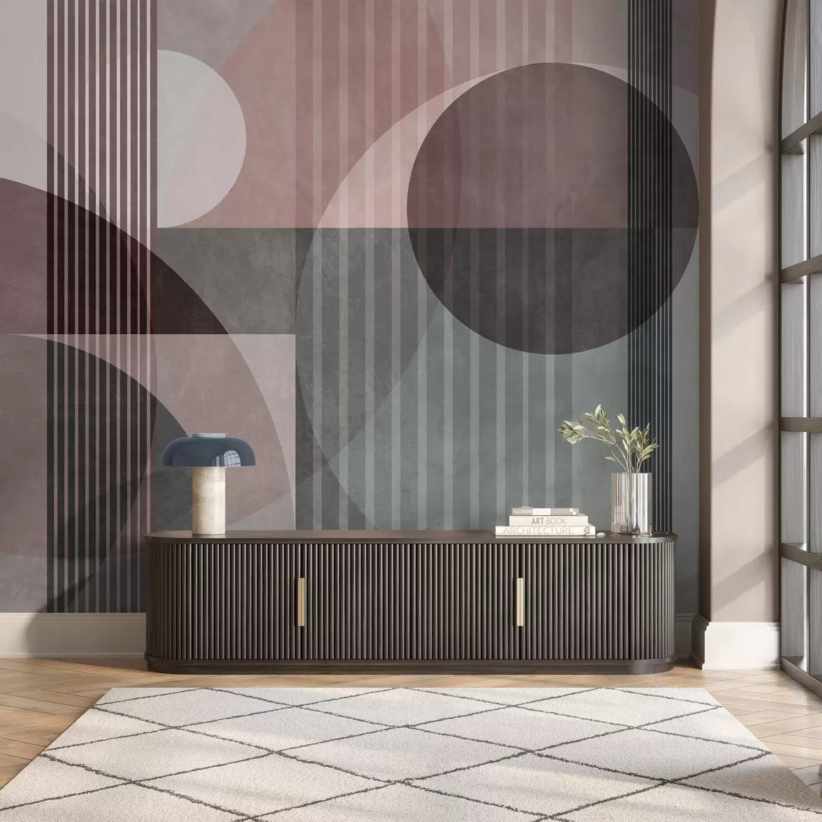 Carta da parati Forme geometriche astratte composte da cerchi e linee, tonalità tenui, composizione ricca di texture e stratificata nr. w09834v1