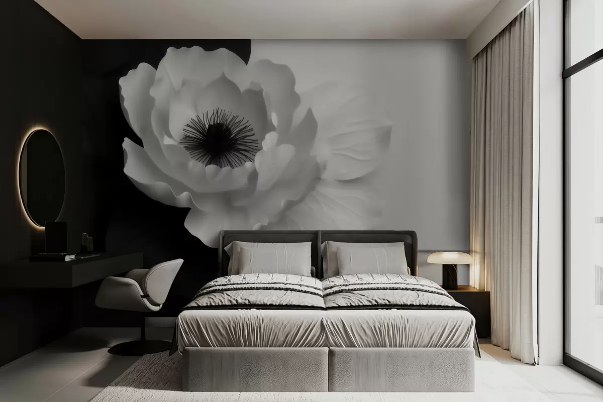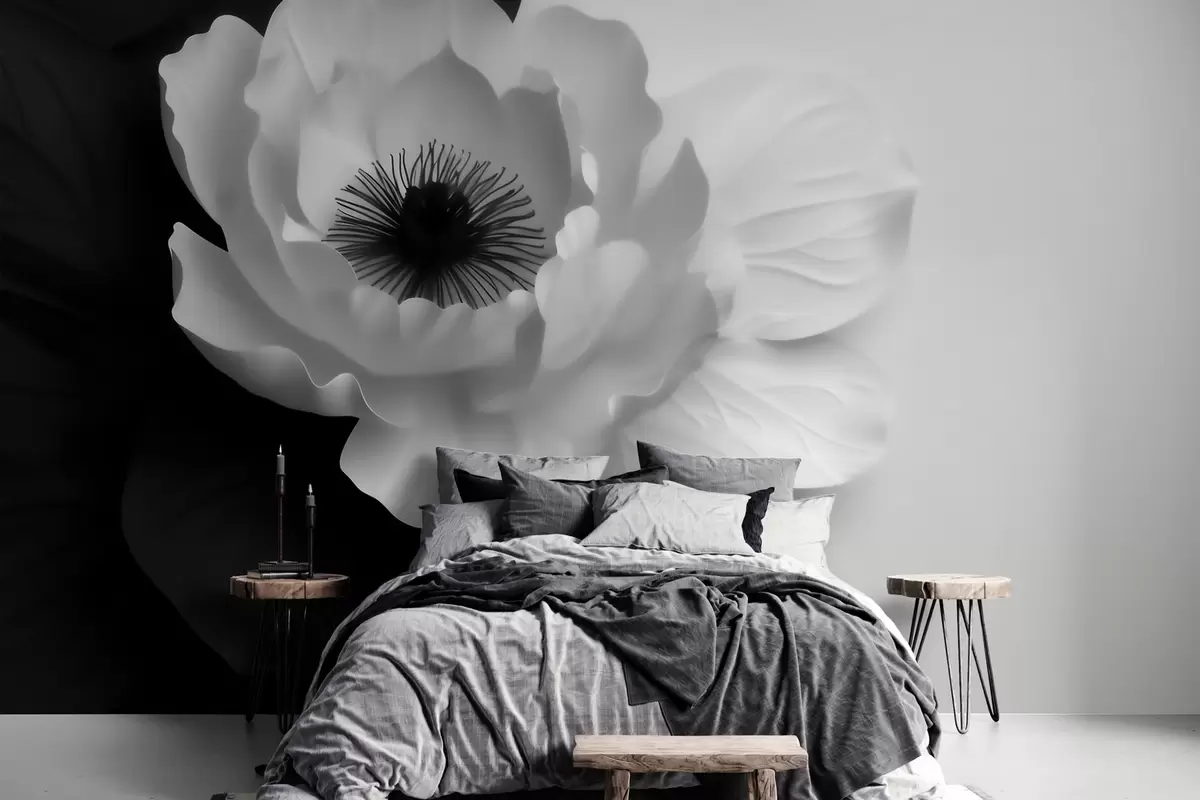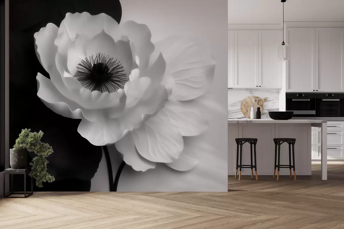Carta da parati Un fiore bianco che crea un contrasto con il centro scuro su uno sfondo bianco e nero nr. w09852