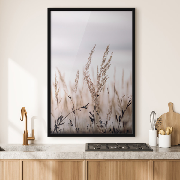Canneti morbidi in riva a un lago nebbioso, tonalità beige pastello