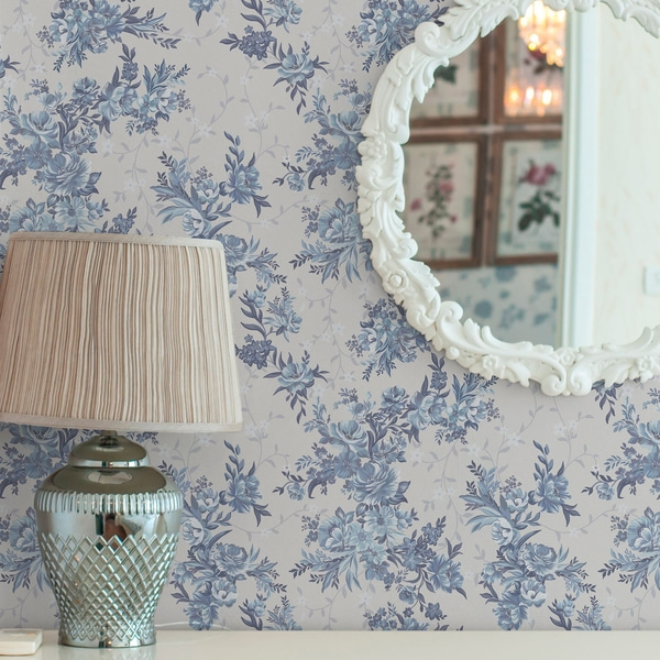 Rami blu acquerellati con fiori e farfalle su sfondo chiaro