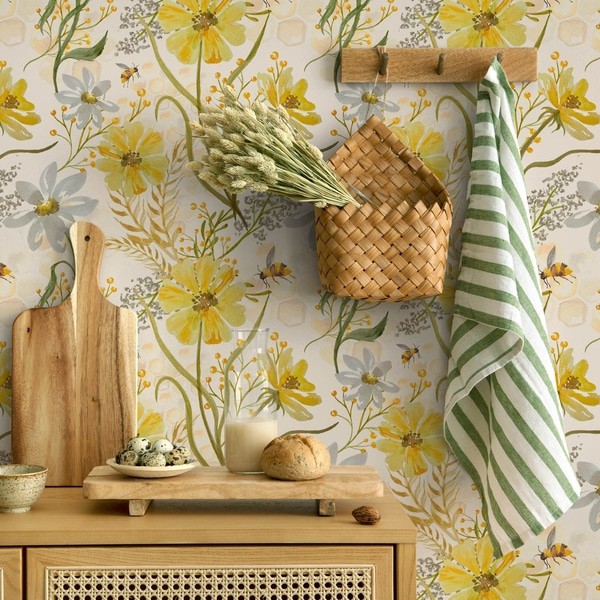 Fiori gialli e blu con foglie su sfondo azzurro cielo