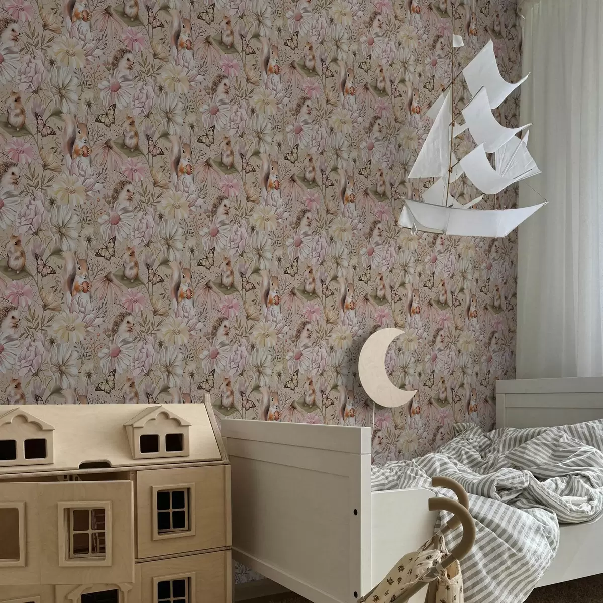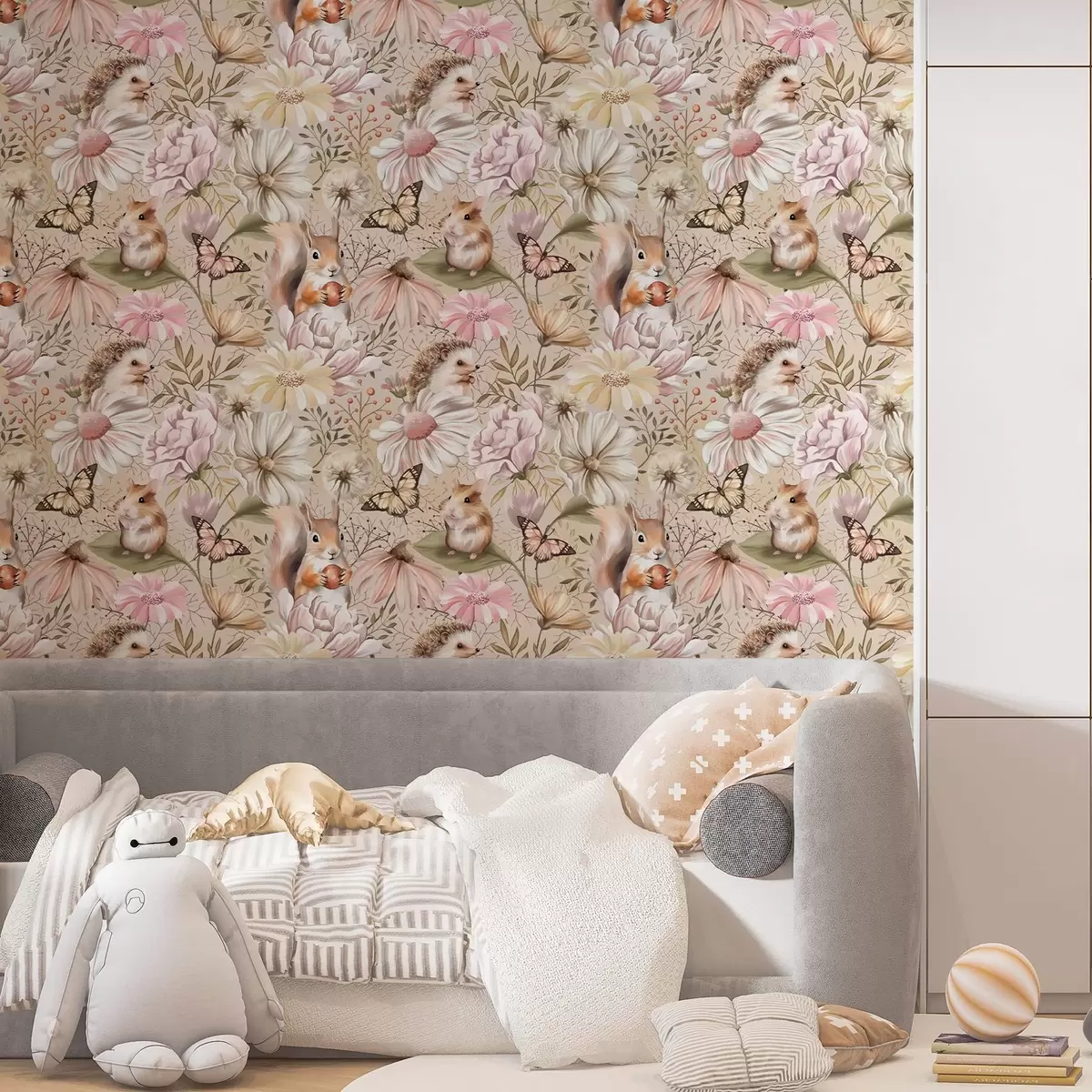 Carta da parati Simpatici riccio, scoiattolo, criceto e farfalle con fiori in colori pastello Nr. a00051