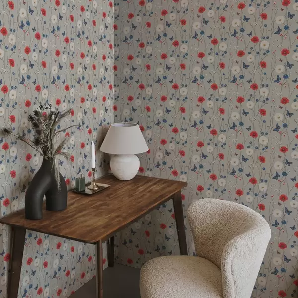 Carta da parati Papaveri, margherite e farfalle su sfondo grigio chiaro Nr. a00072v1