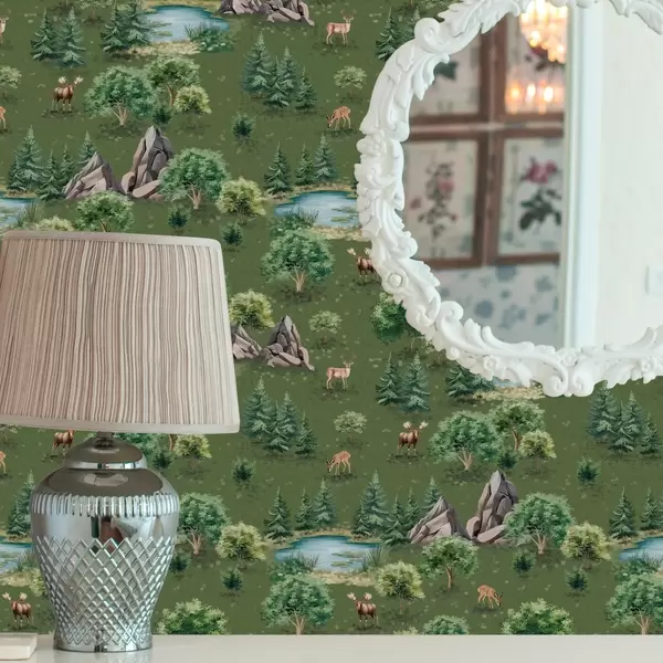 Carta da parati Cervi in riva al lago con alberi e rocce Nr. a00086