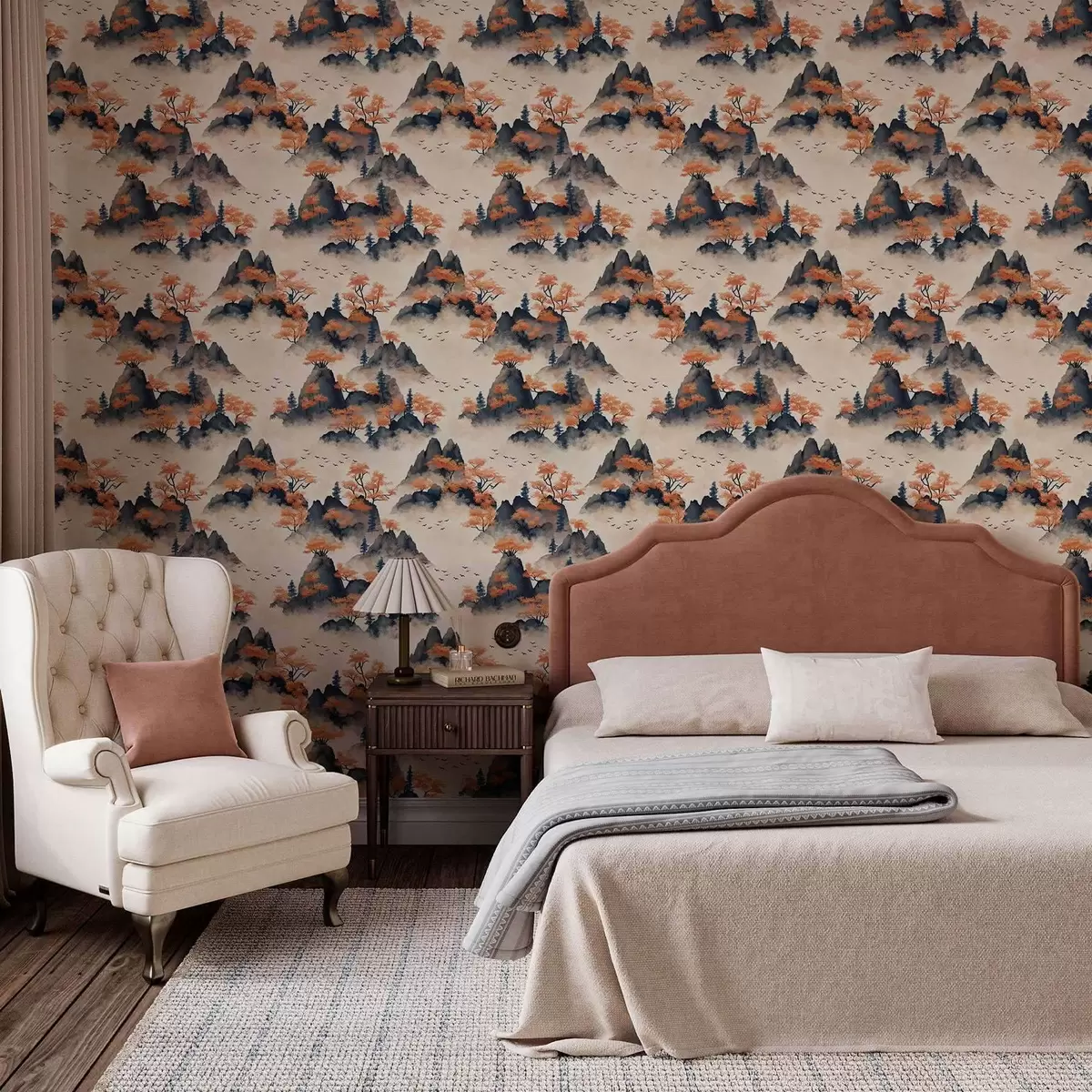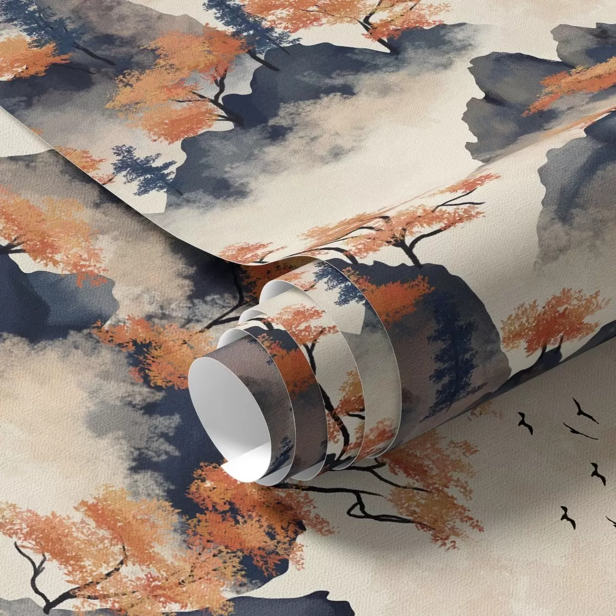 Carta da parati Montagne autunnali nella nebbia con alberi e uccelli arancioni Nr. a00104
