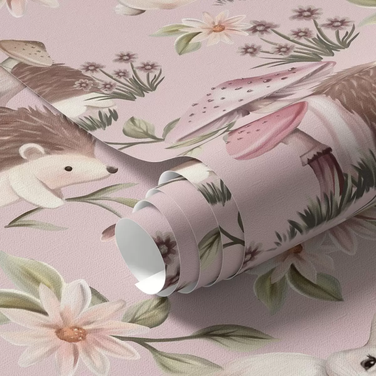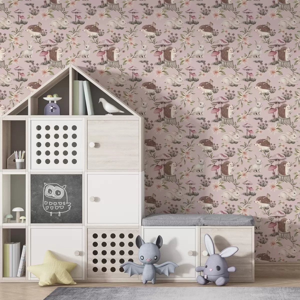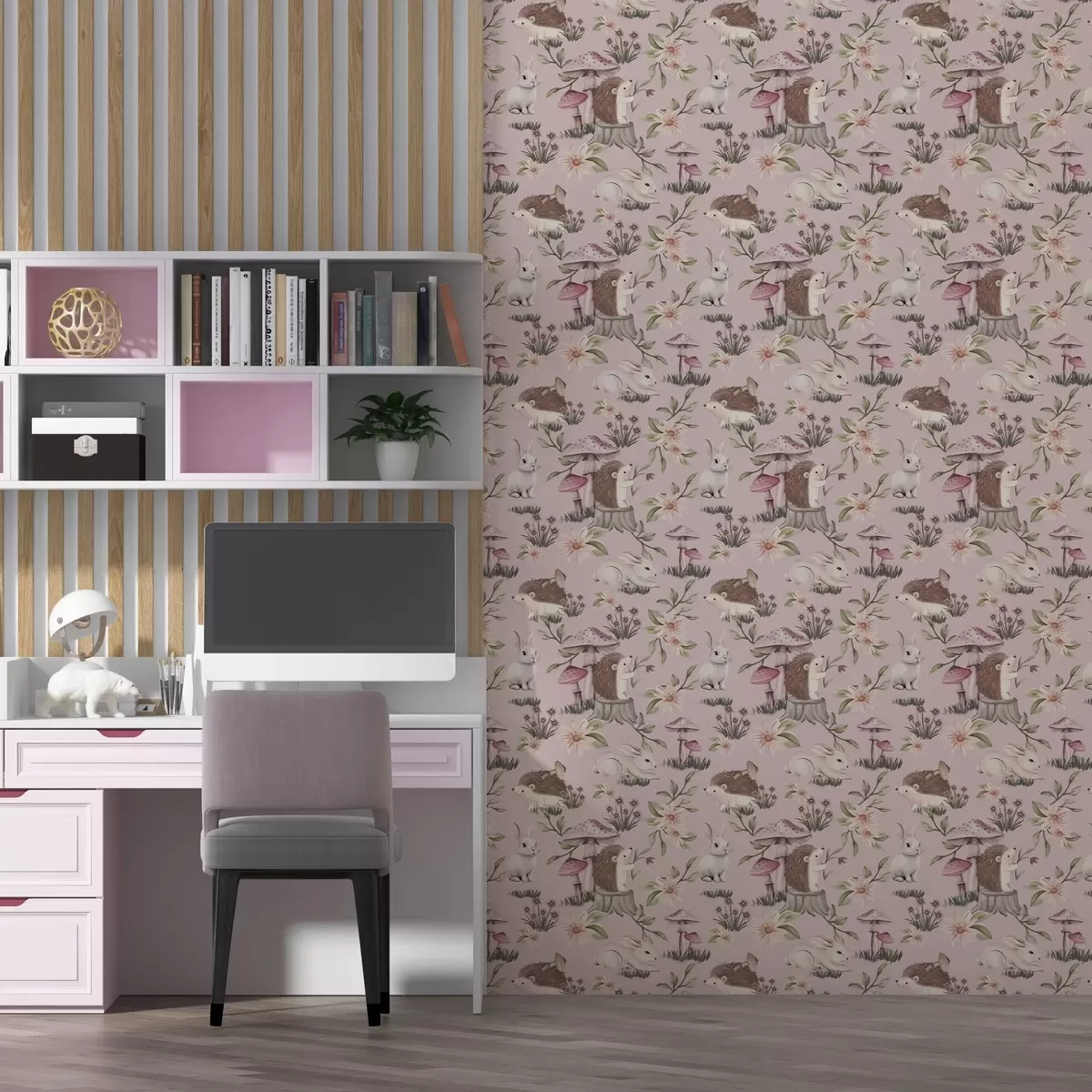 Carta da parati Ricci, conigli e fiori in stile fiabesco tra i funghi su sfondo rosa Nr. a00111