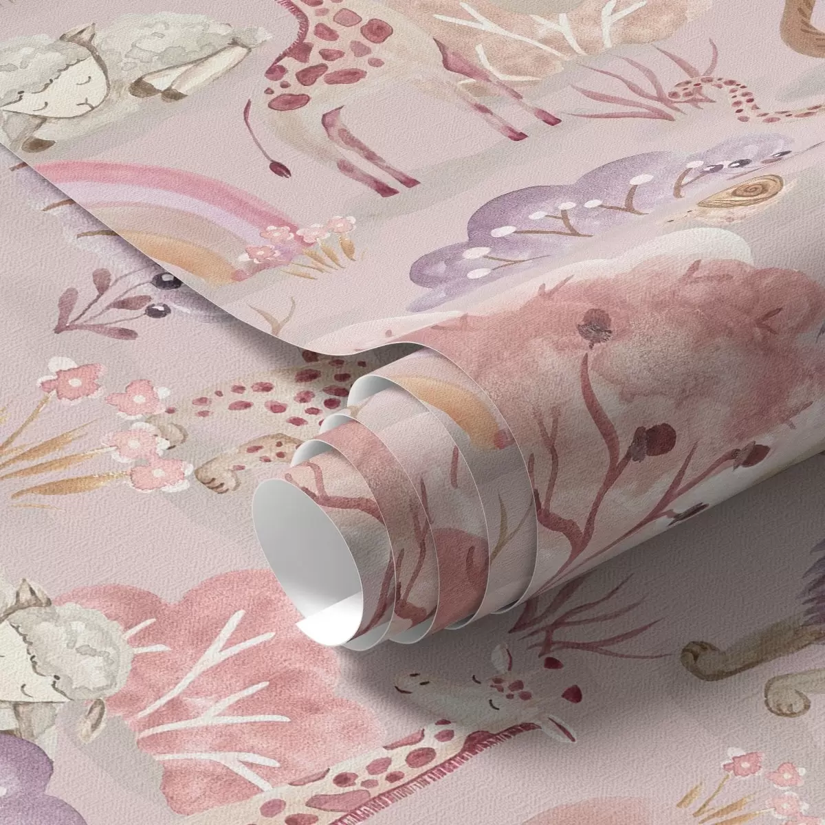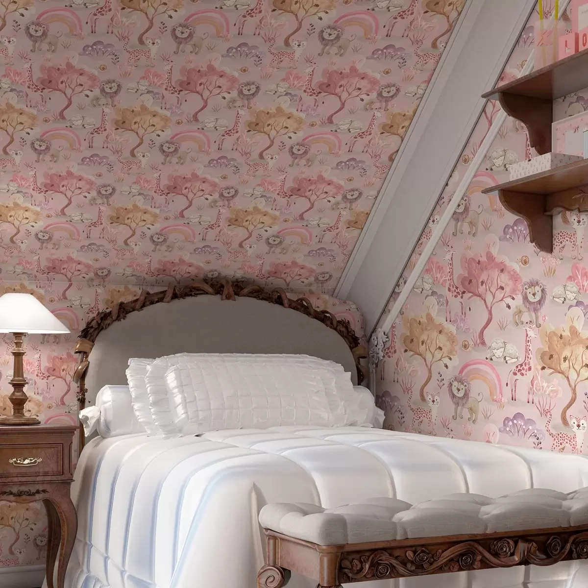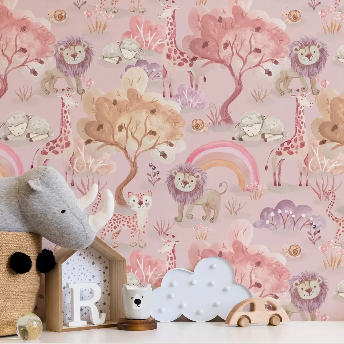 Carta da parati Cuccioli di leone, giraffe e arcobaleni in una foresta pastello Nr. a00112