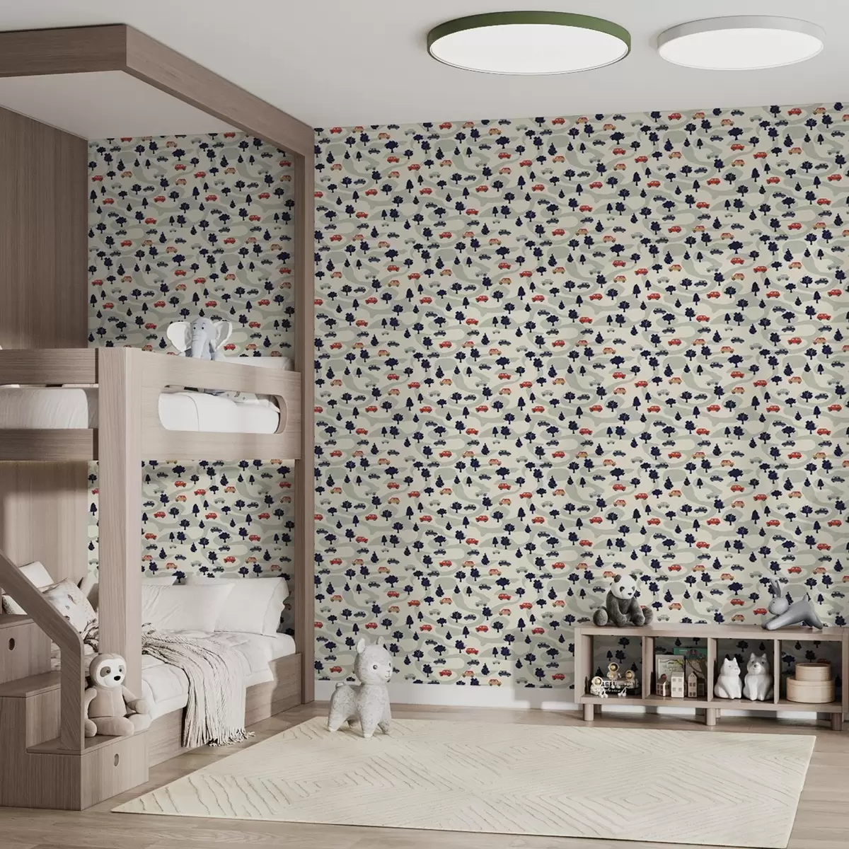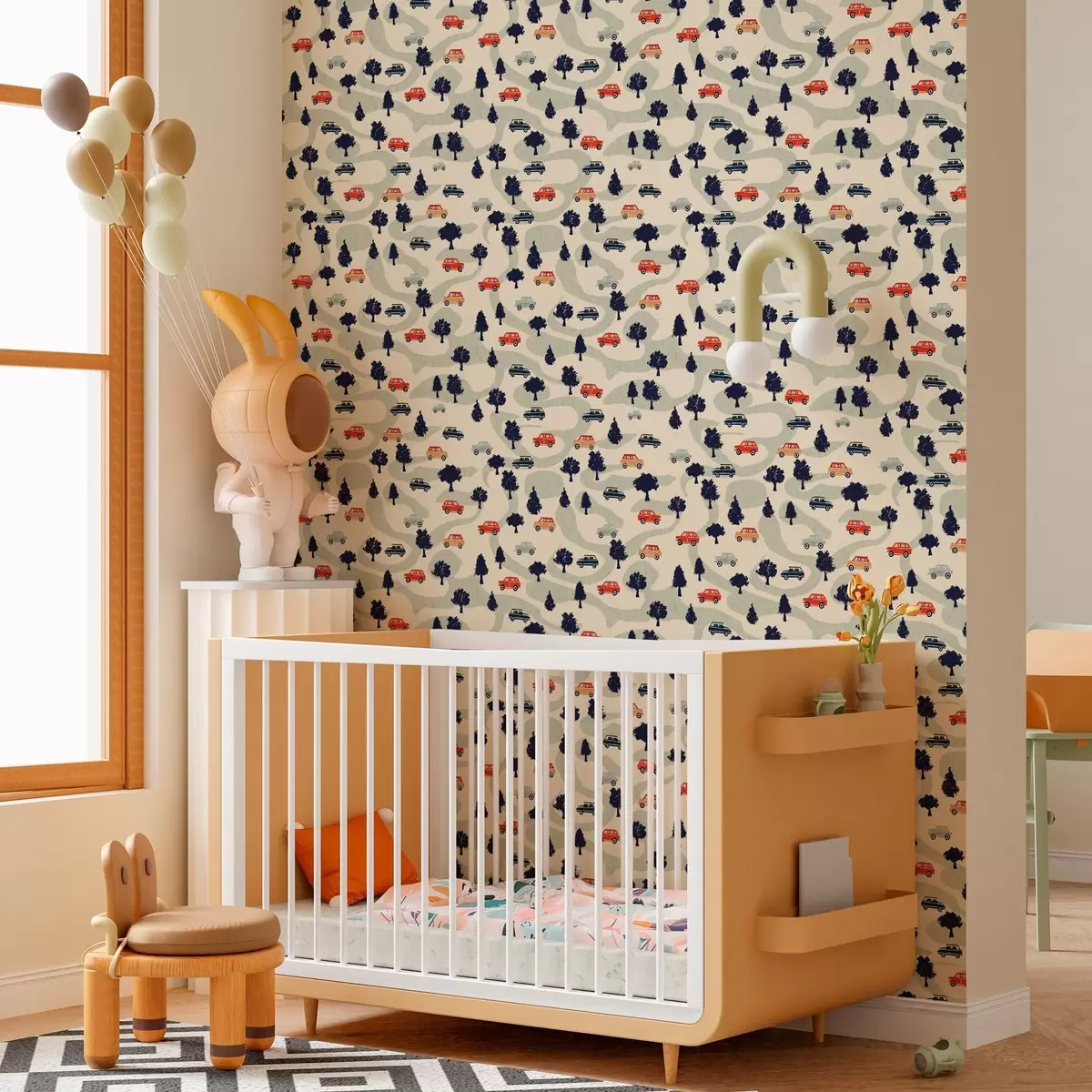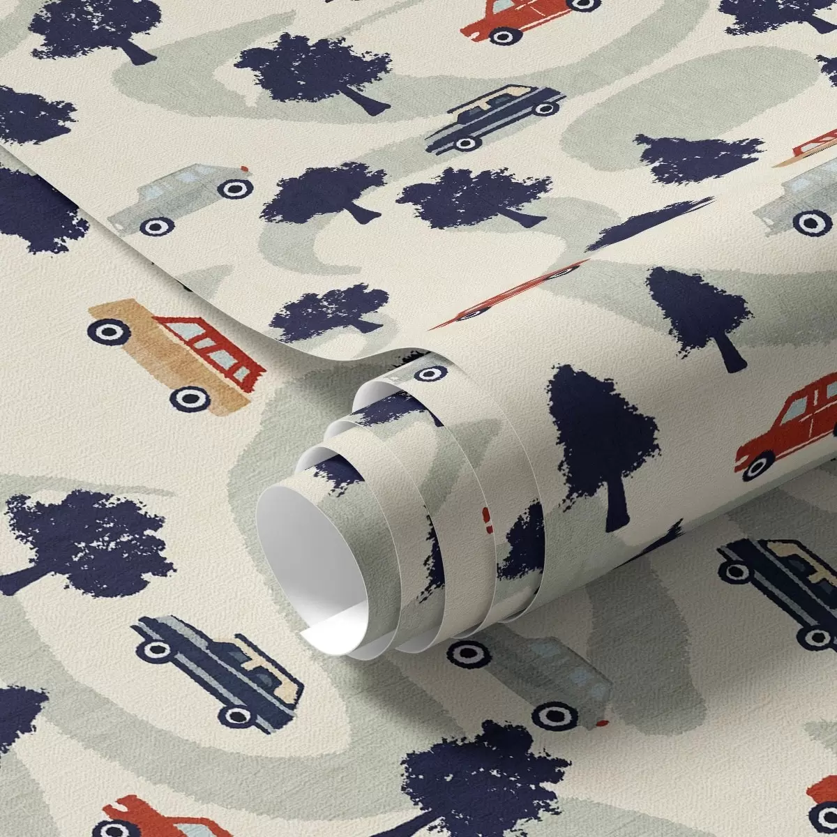 Carta da parati Auto divertenti tra gli alberi su uno sfondo color crema Nr. a00119