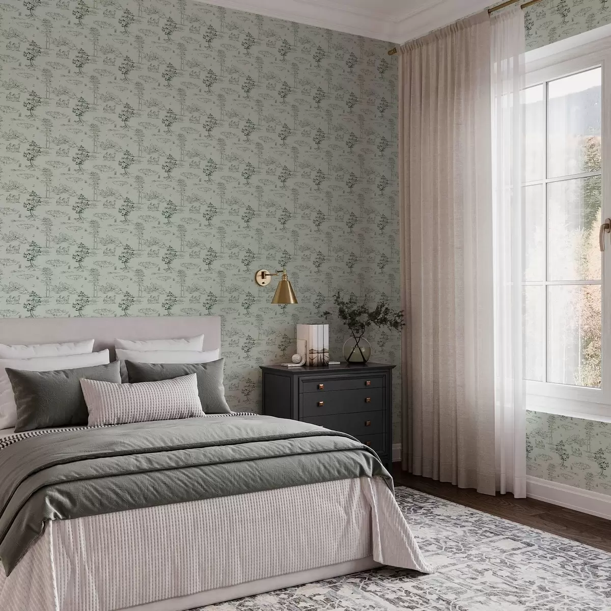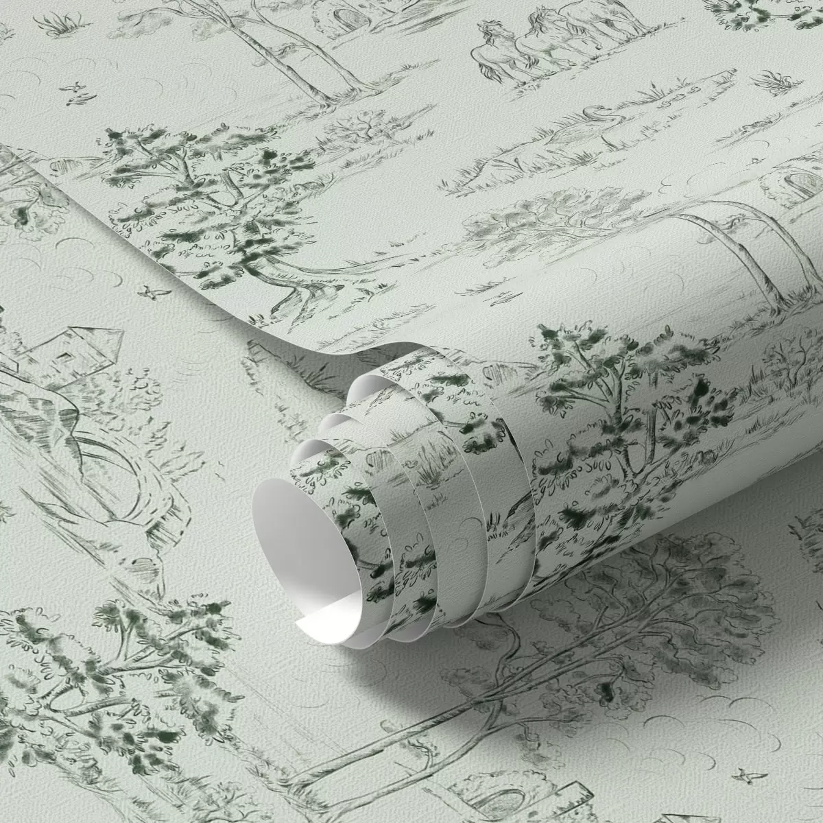 Carta da parati Scena con cavalli, alberi e castello su sfondo verde Nr. a00133v1