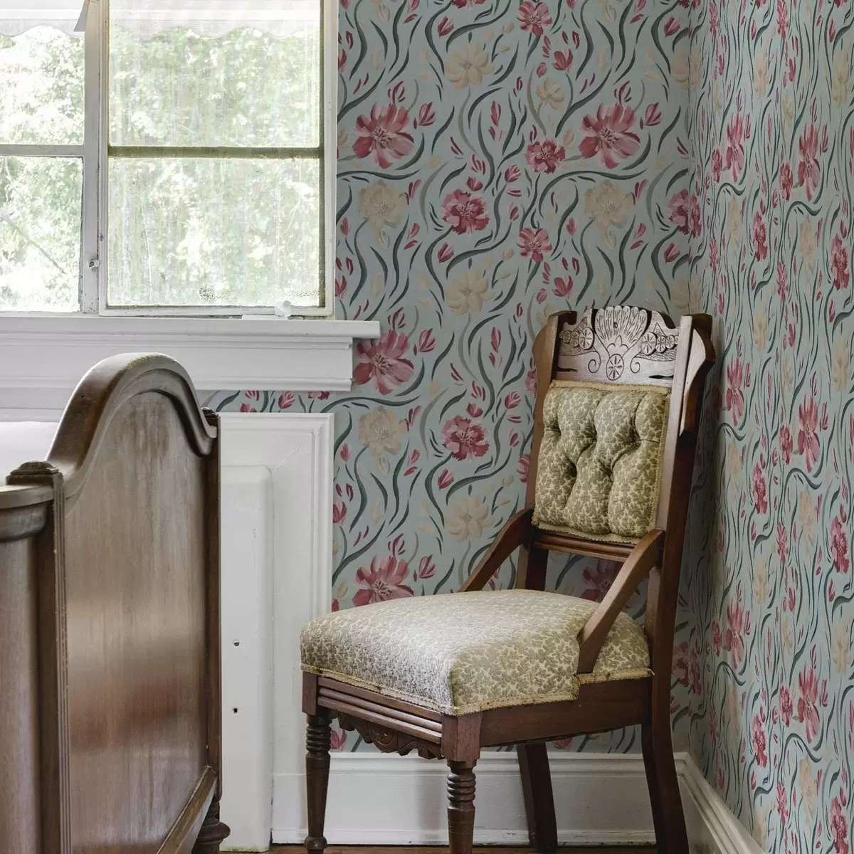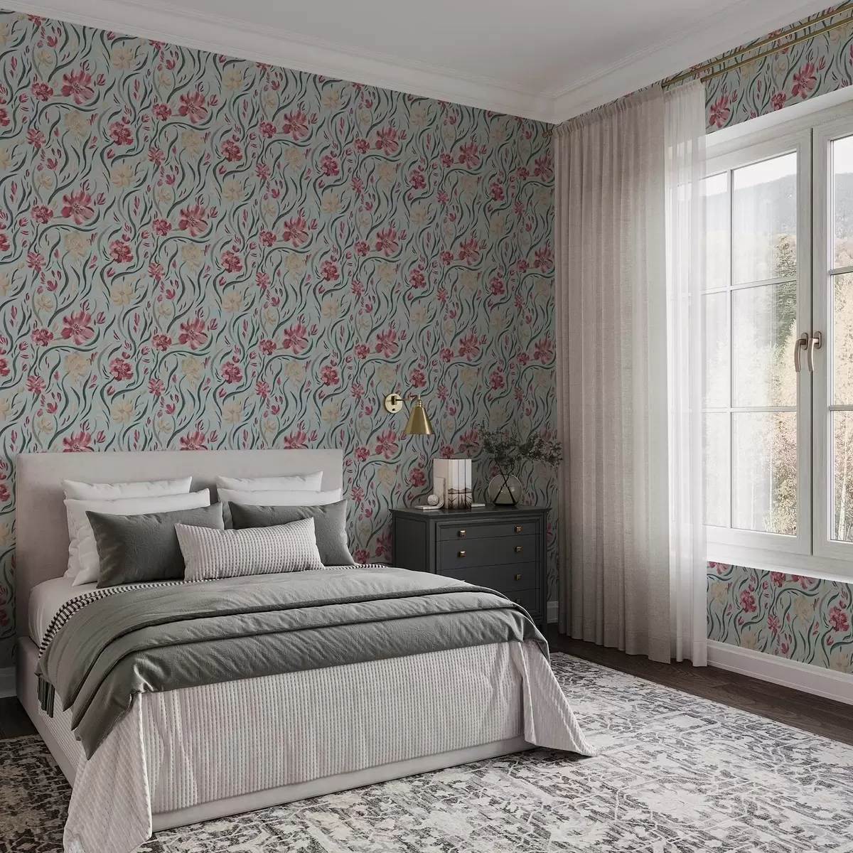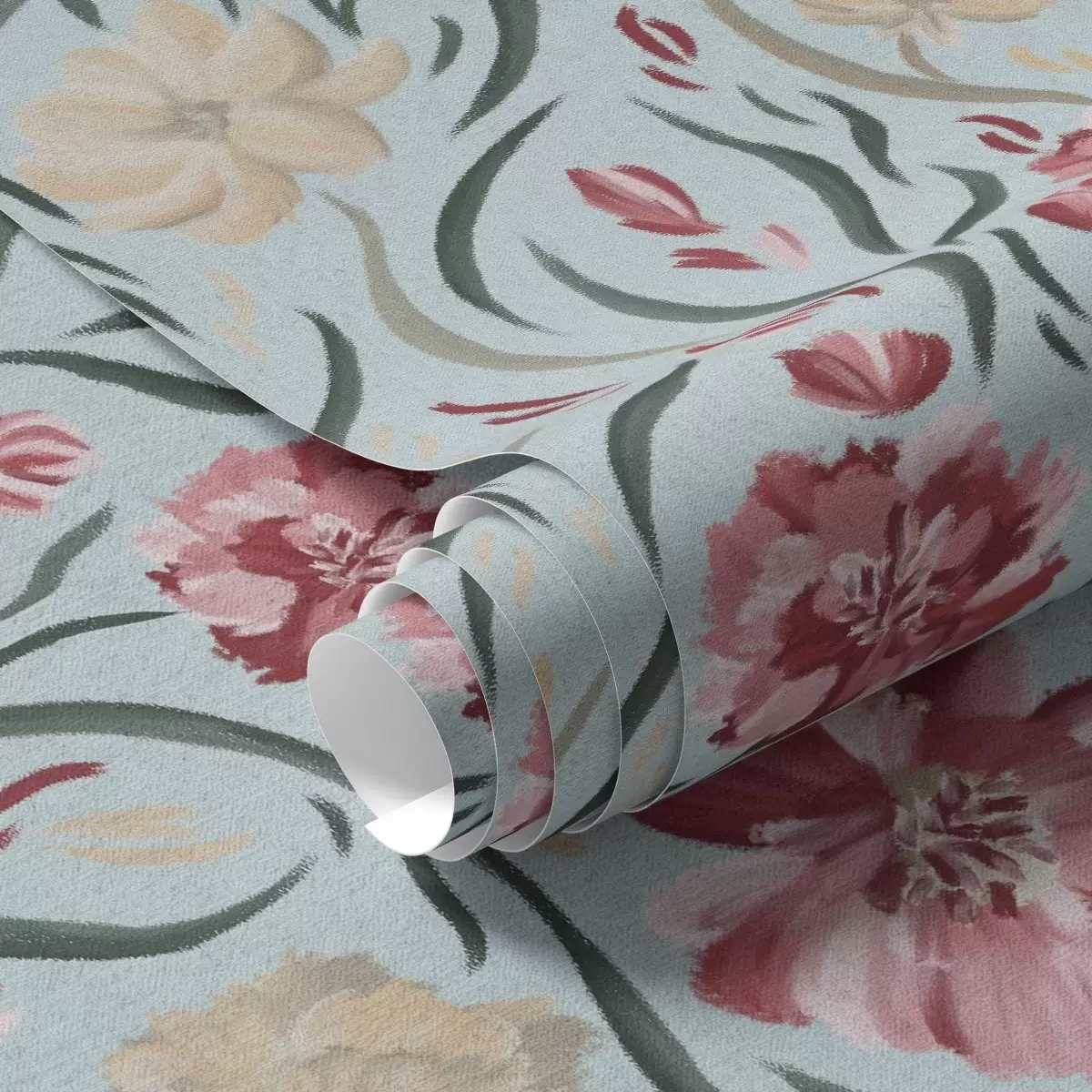 Carta da parati Fiori acquerellati su sfondo blu, motivo rosso e beige Nr. a00216