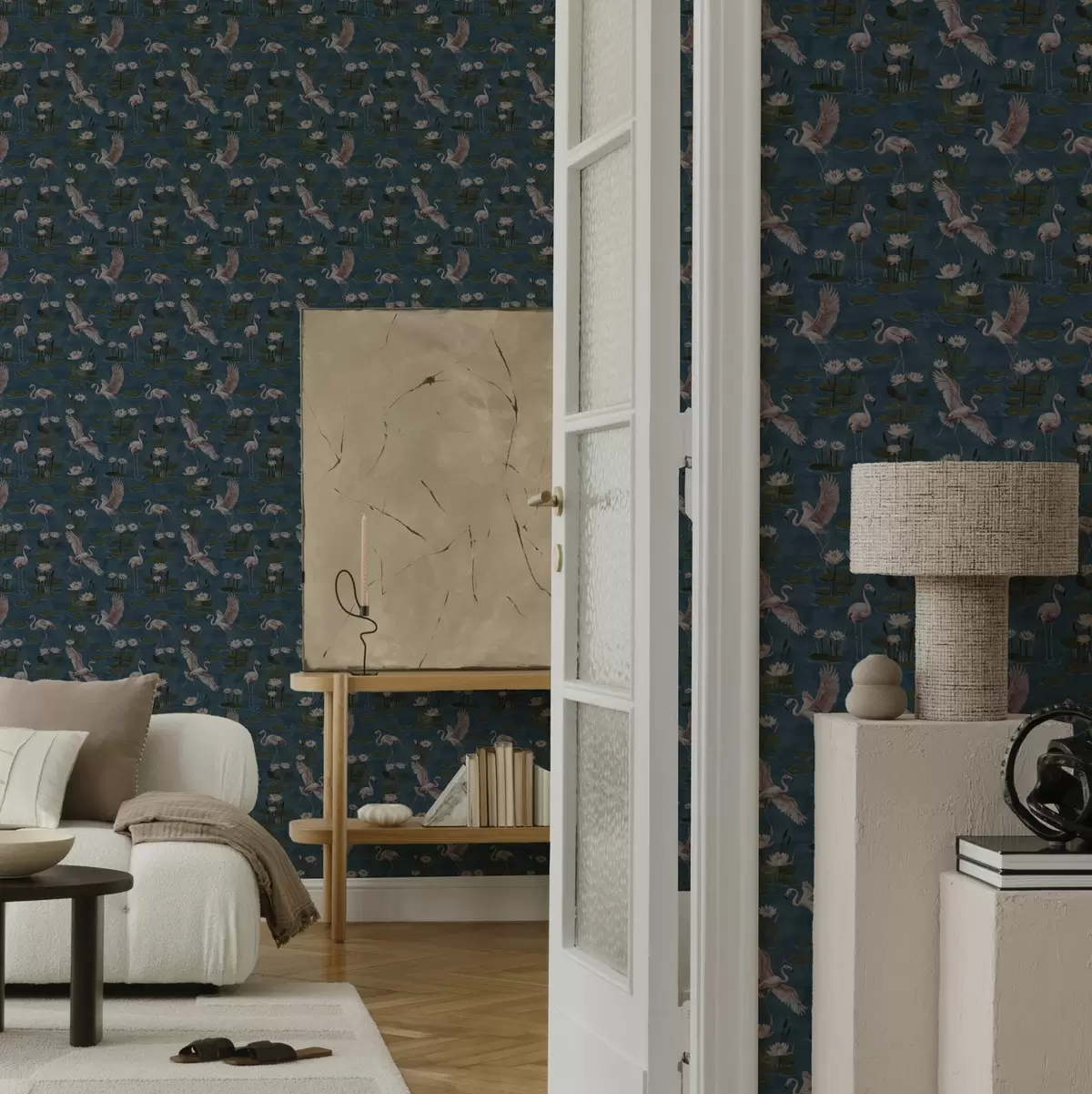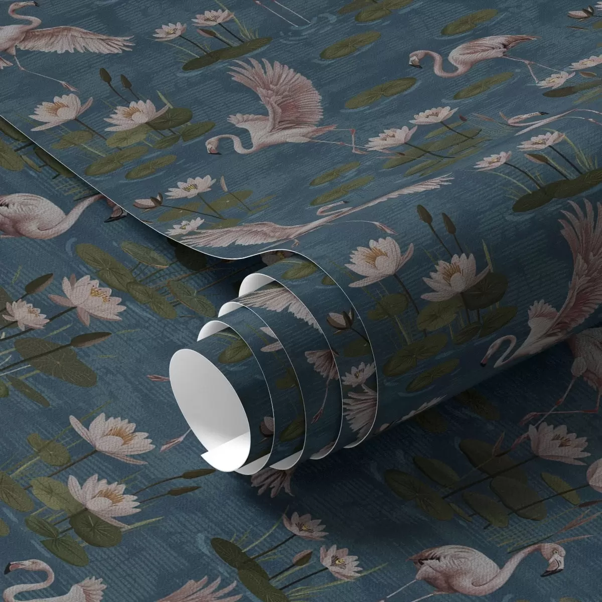 Carta da parati Fenicottero tra ninfee, scena tropicale su sfondo blu navy Nr. a00237