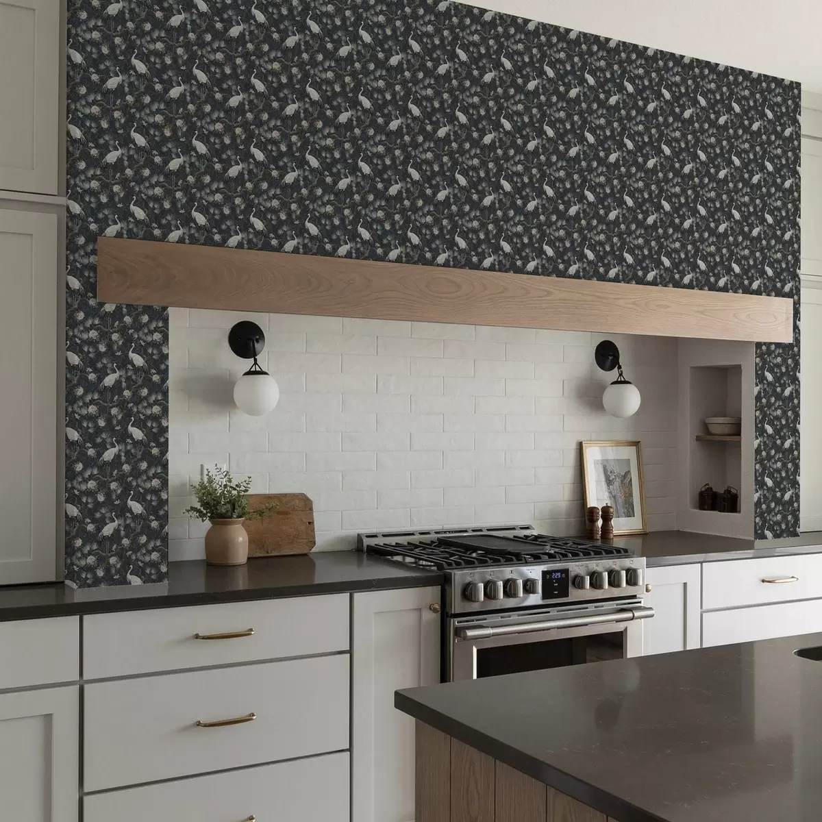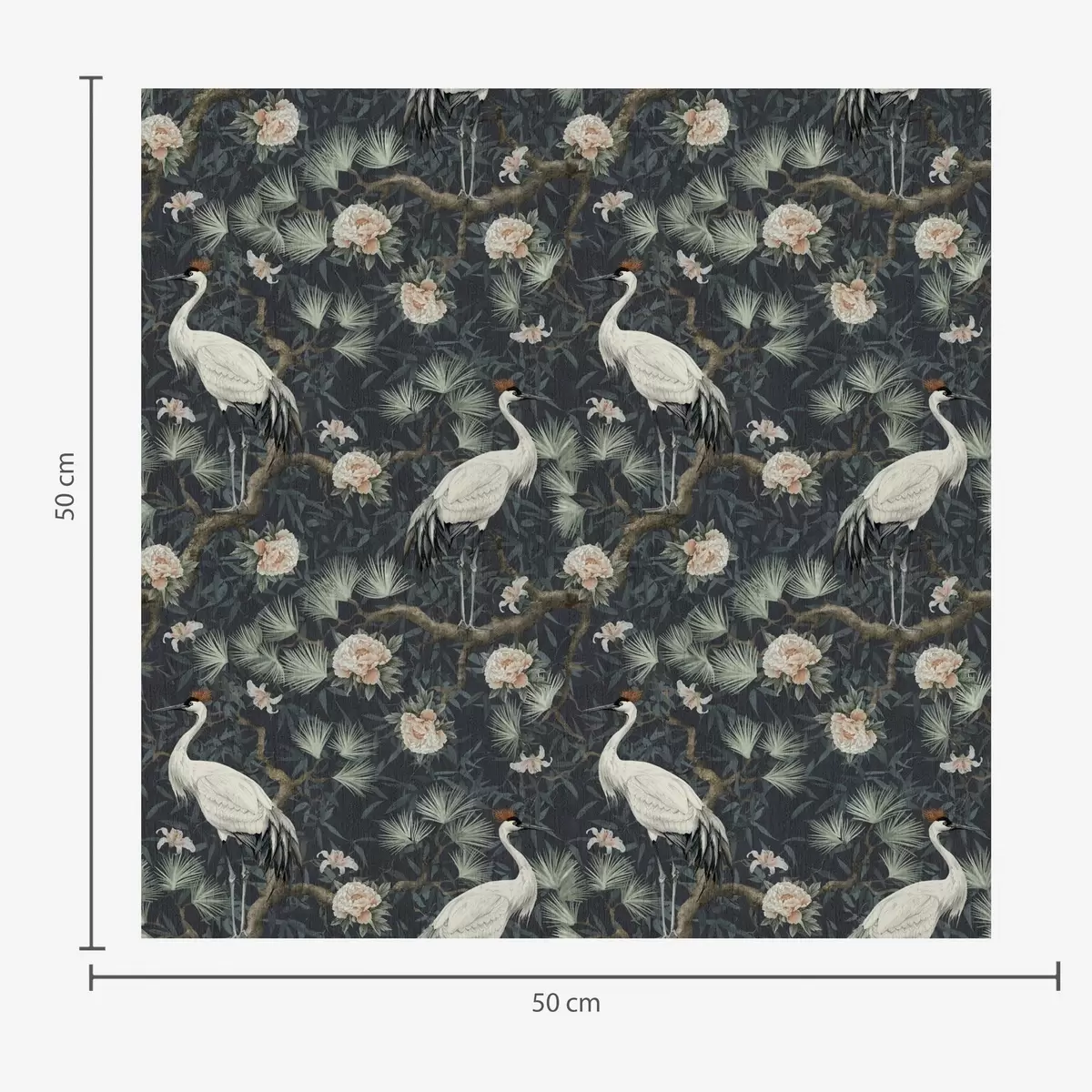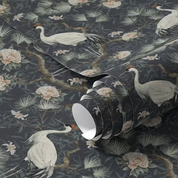Carta da parati Gru tra pini e peonie su sfondo scuro Nr. a00241