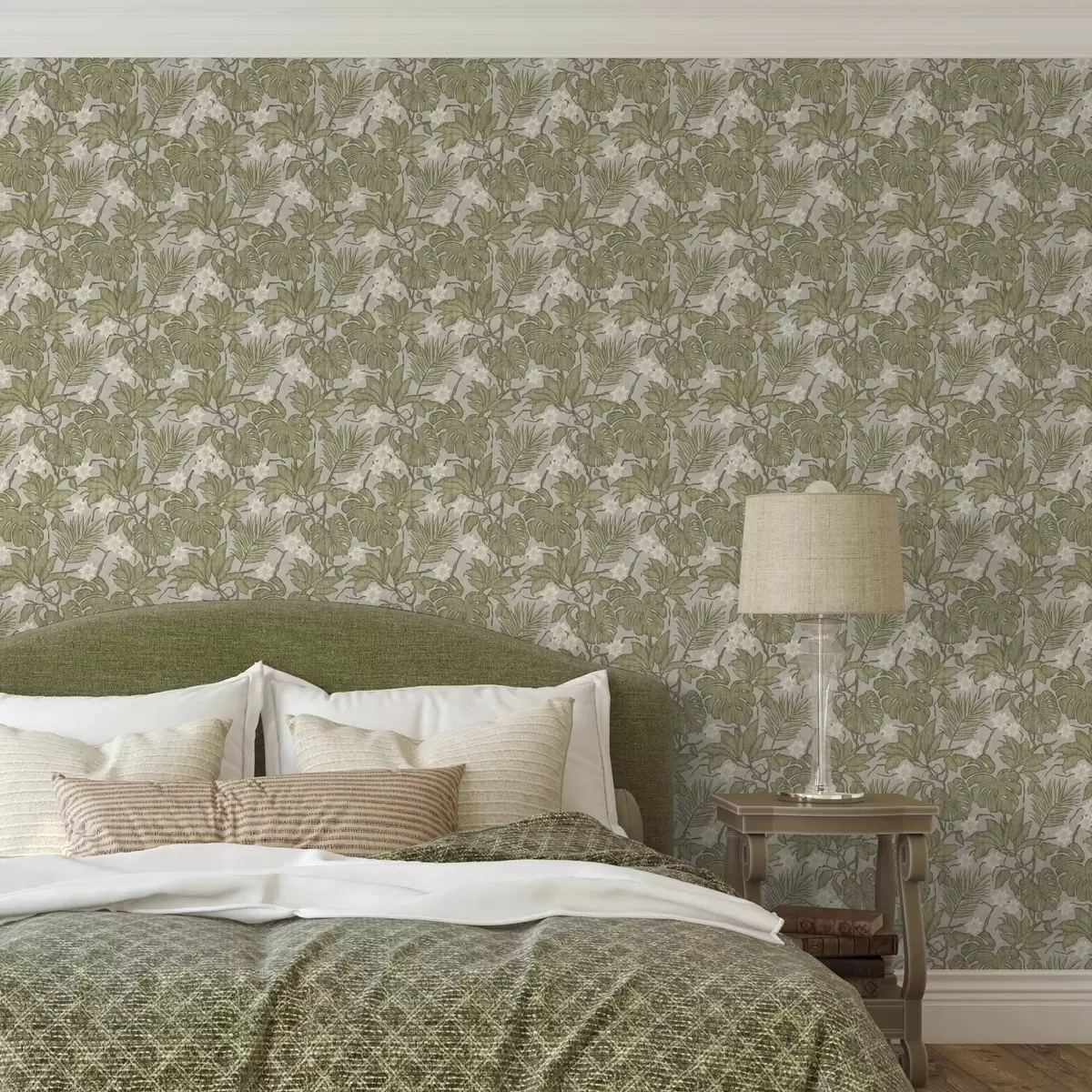Carta da parati Foglie e fiori di monstera tropicale su sfondo grigio Nr. a00249