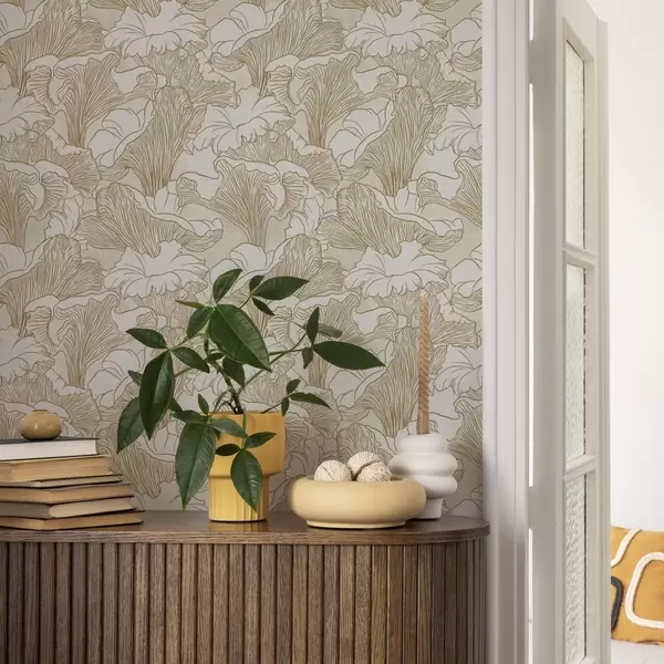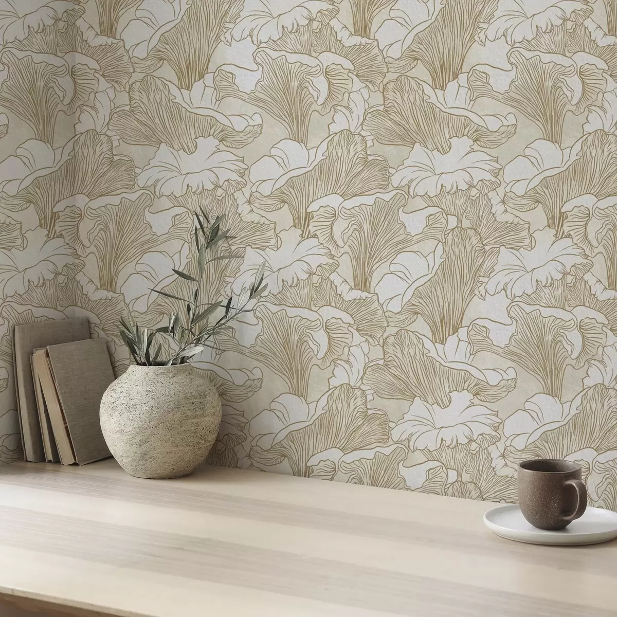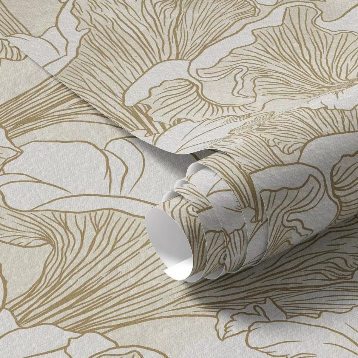 Carta da parati Funghi galletti, disegno al tratto su sfondo crema a00275