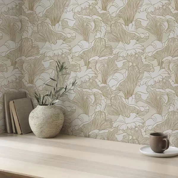 Carta da parati Funghi galletti, disegno al tratto su sfondo crema Nr. a00275