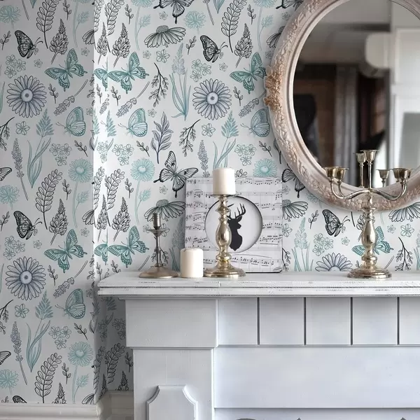 Carta da parati Contorno di farfalle e fiori nei toni del blu e dell'azzurro Nr. a00311