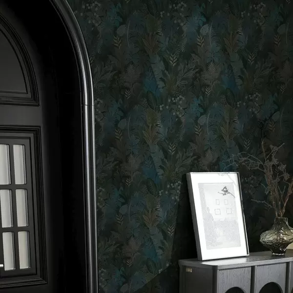 Carta da parati Fogliame tropicale verde scuro con accenti blu Nr. a00327