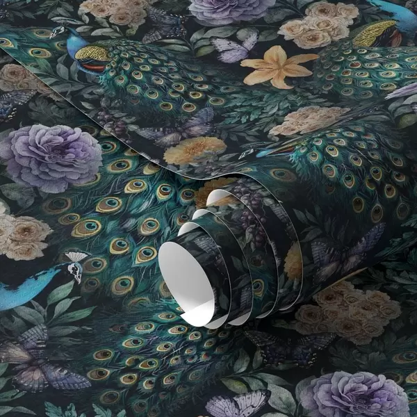 Carta da parati Pavoni tra fiori scuri e farfalle Nr. a00348