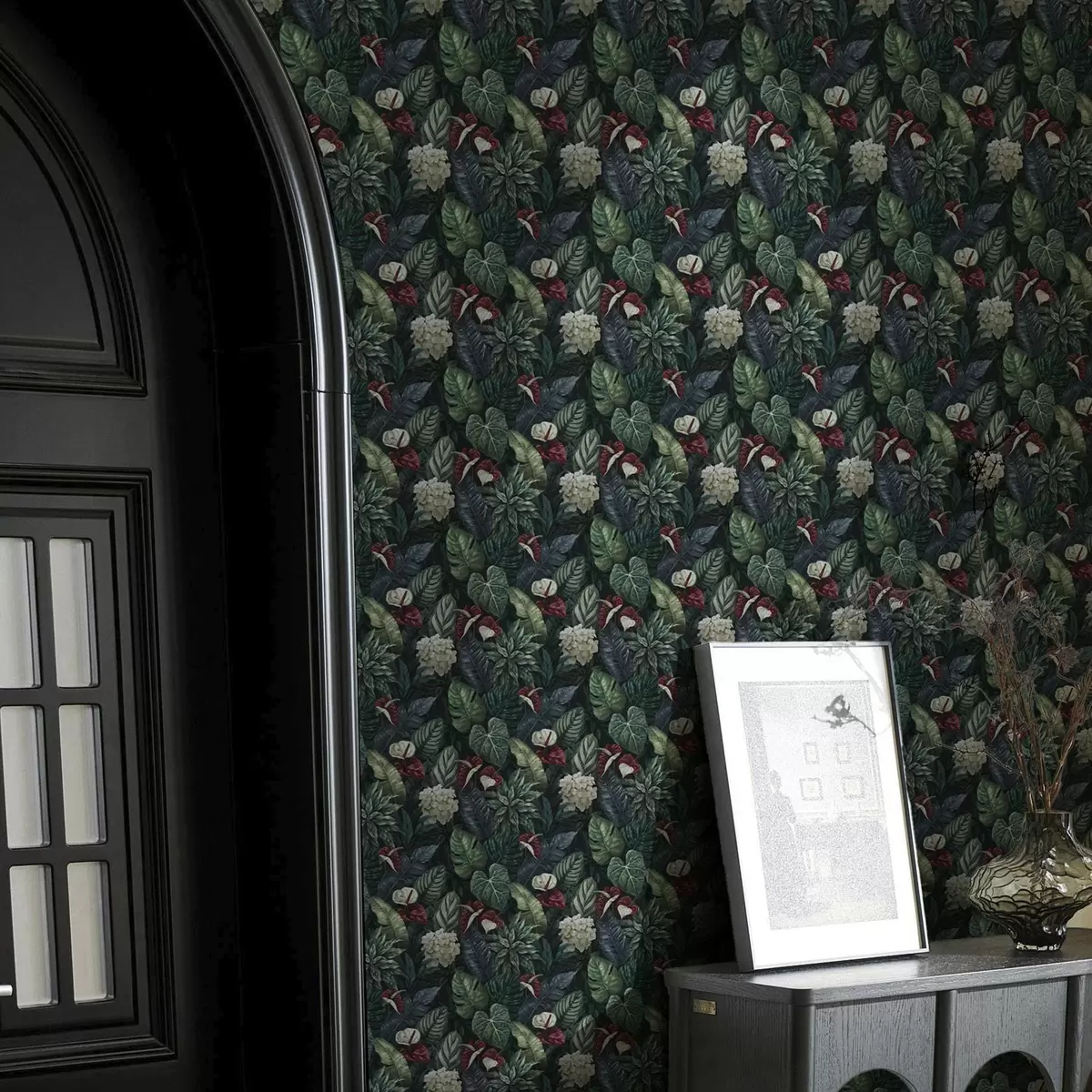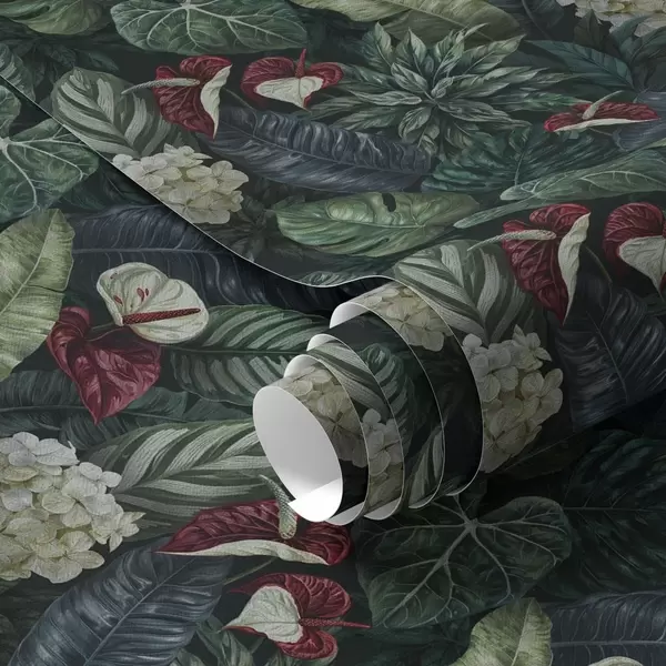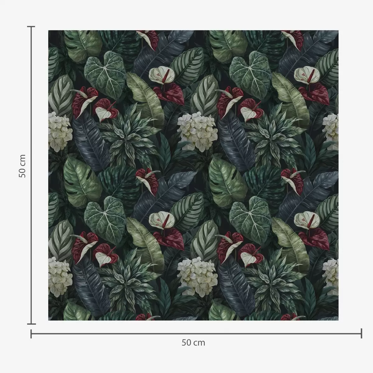 Carta da parati Foglie tropicali con fiori bianchi e rossi Nr. a00361