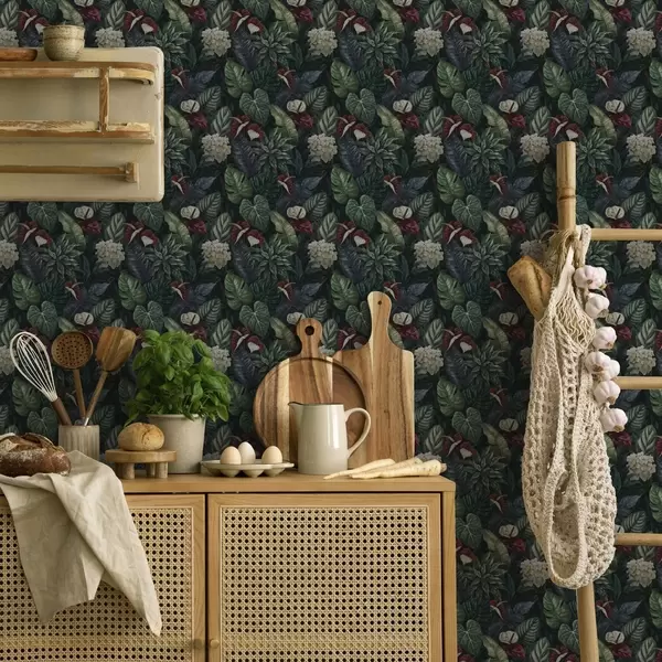 Carta da parati Foglie tropicali con fiori bianchi e rossi Nr. a00361