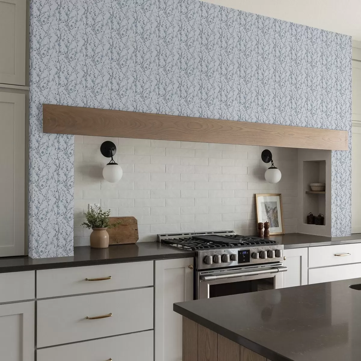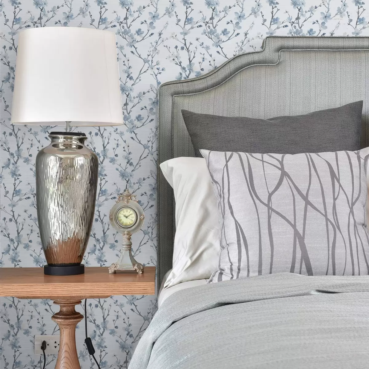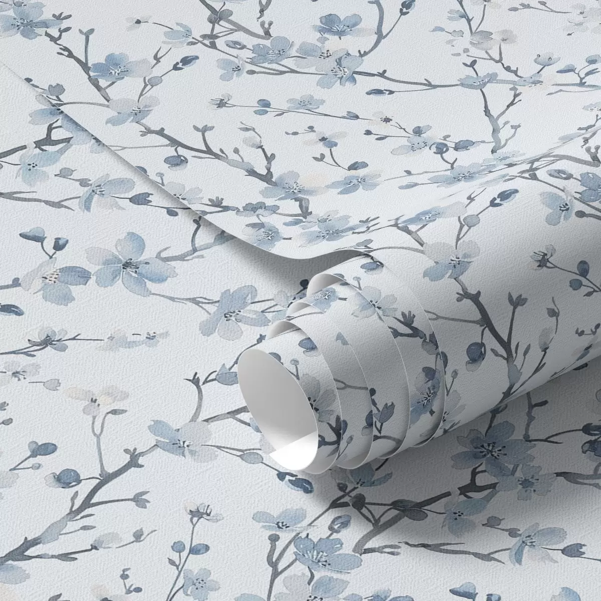 Carta da parati Fiori di ciliegio blu su sfondo bianco con contrasto morbido a00399