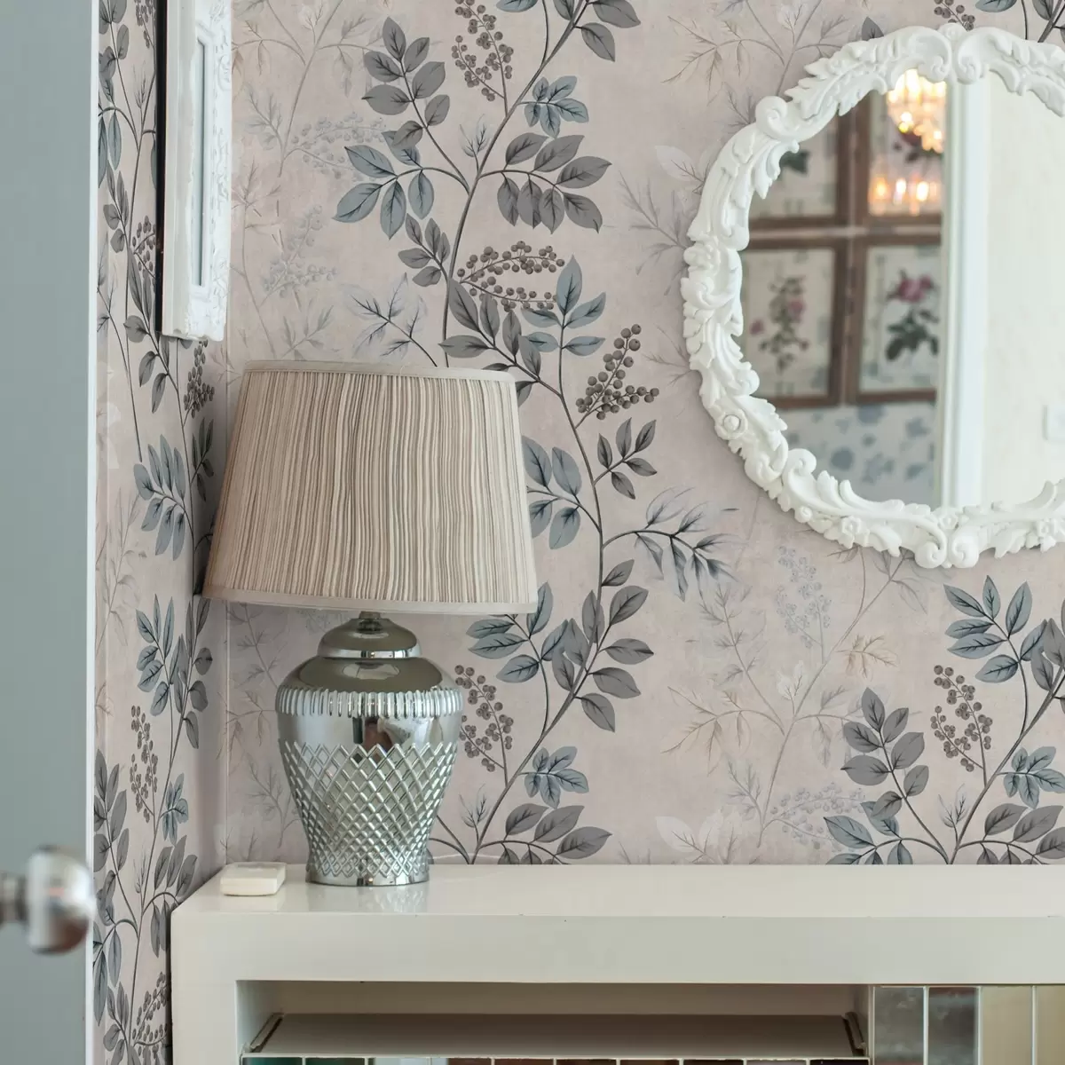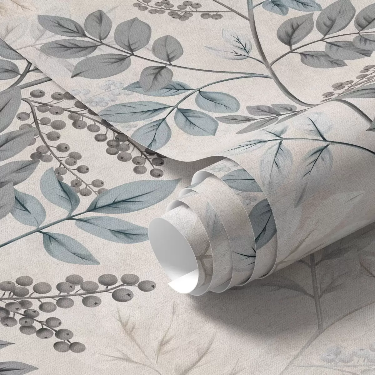Carta da parati Rami di bacche in tonalità pastello con foglie grigio-blu Nr. a00443