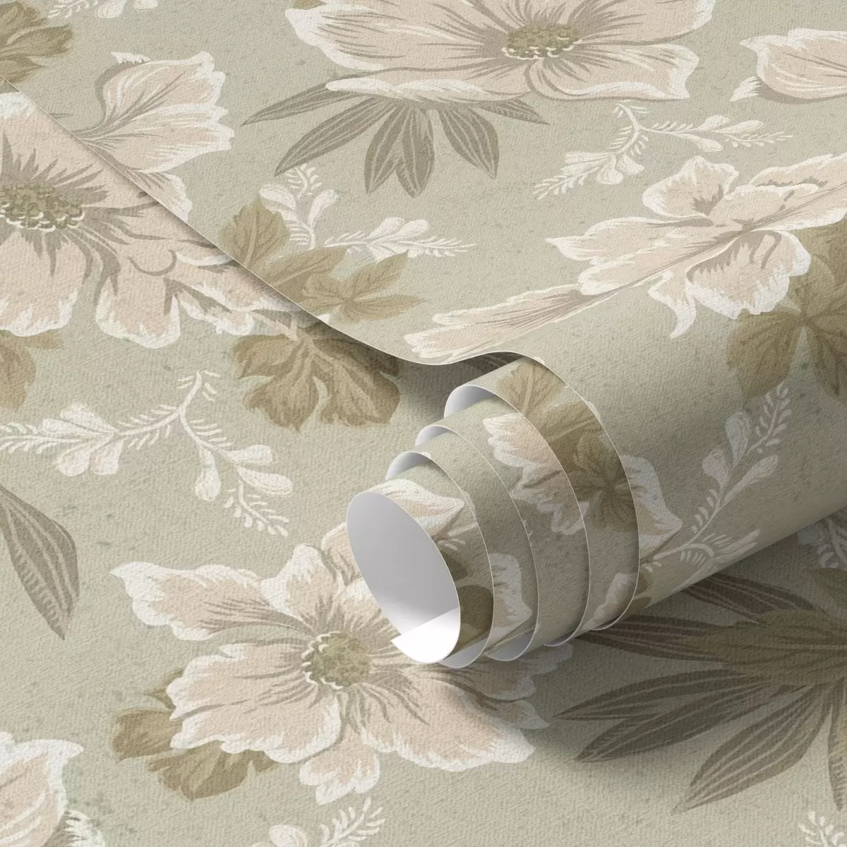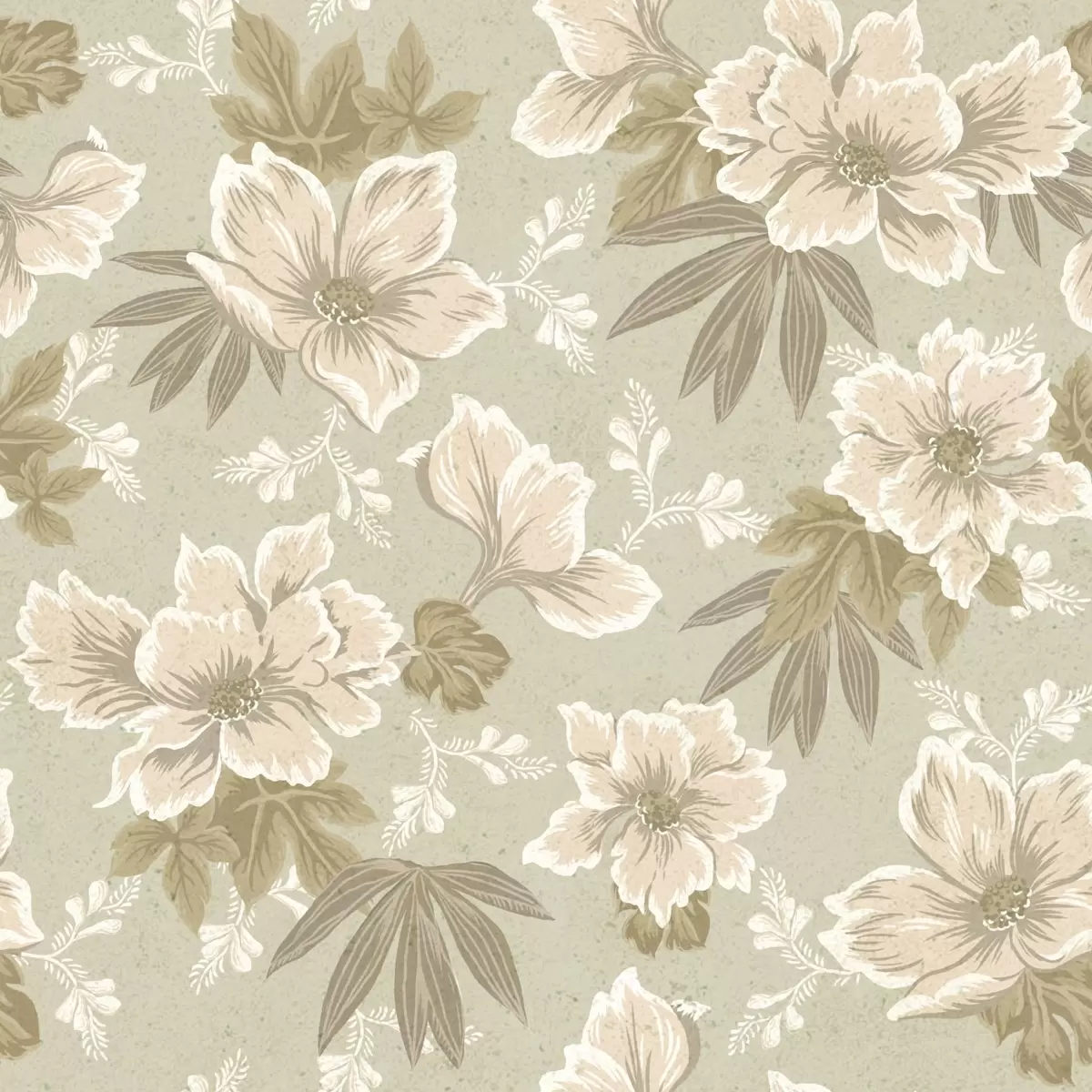 Carta da parati Fiori color crema su sfondo verde oliva Nr. a00462