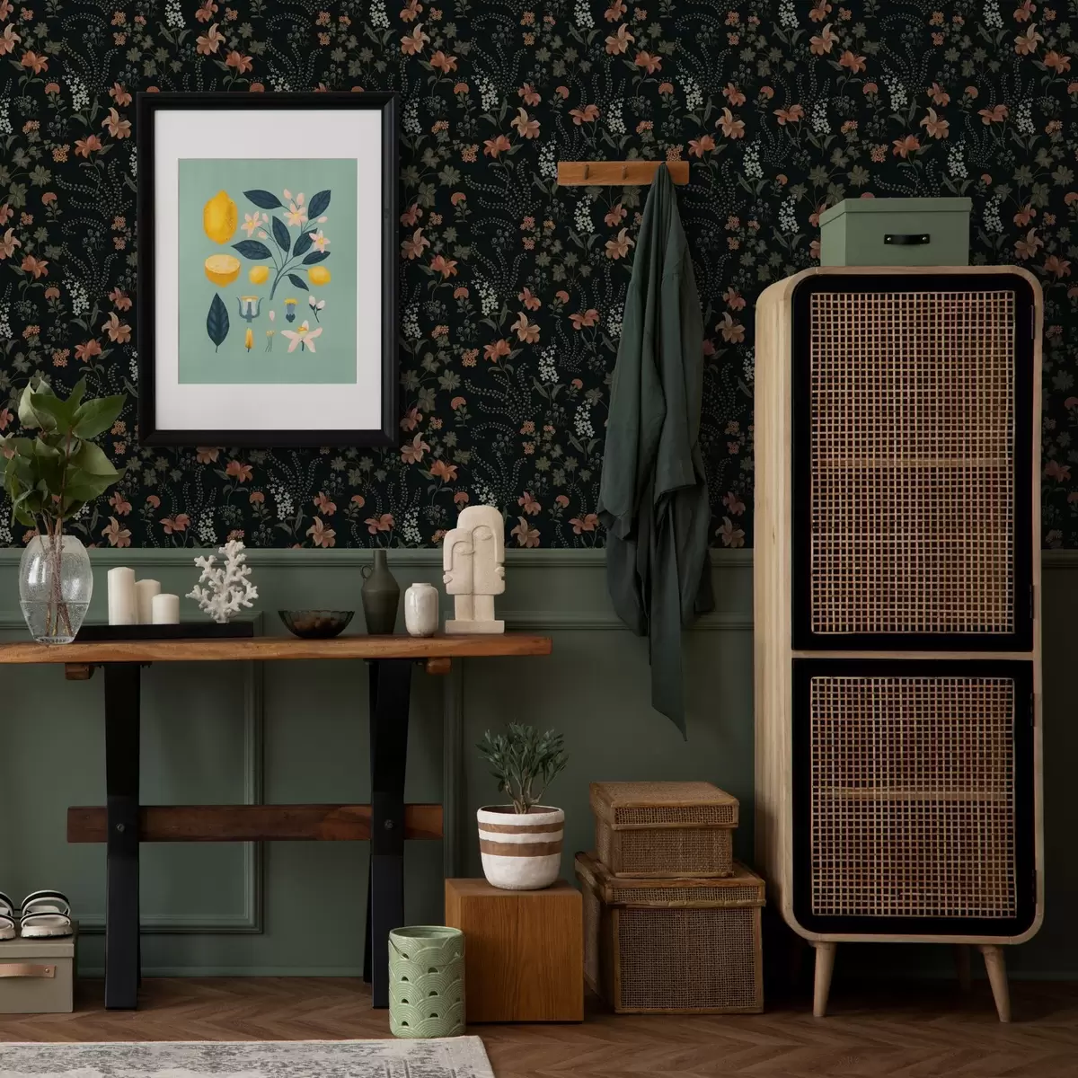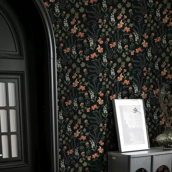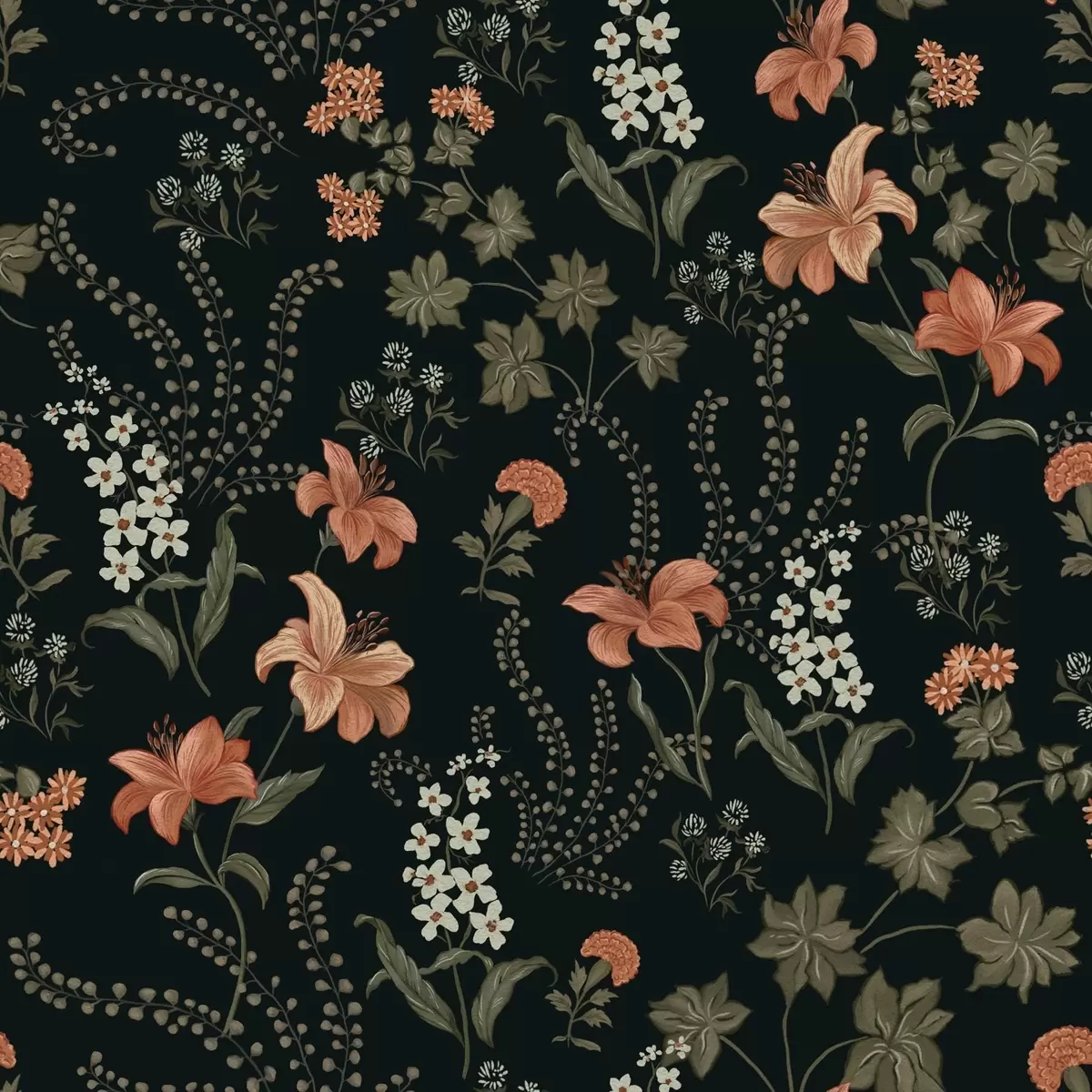 Carta da parati Gigli e piccoli fiori arancioni su sfondo nero Nr. a00463