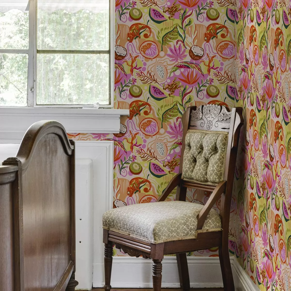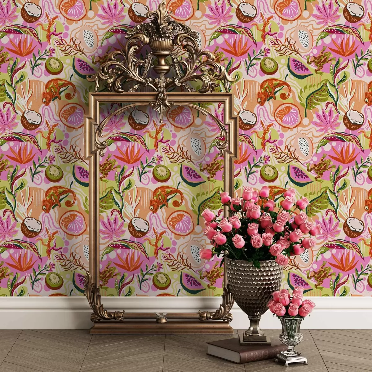 Carta da parati Frutti esotici, foglie e camaleonti in stile tropicale Nr. a00469