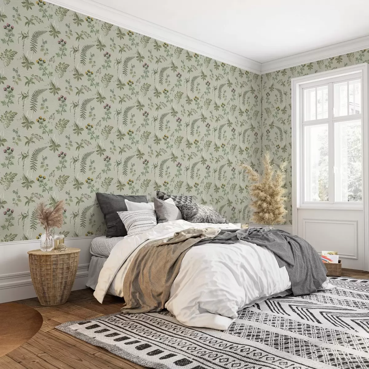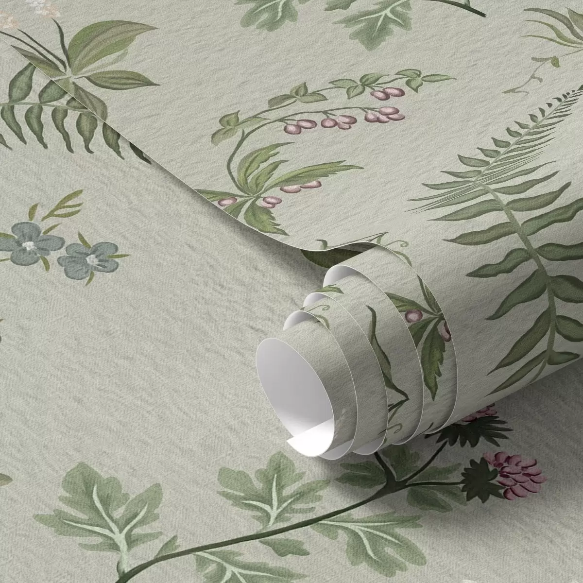 Carta da parati Erbe botaniche e felci su sfondo grigio-verde chiaro Nr. a00498
