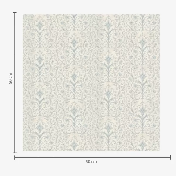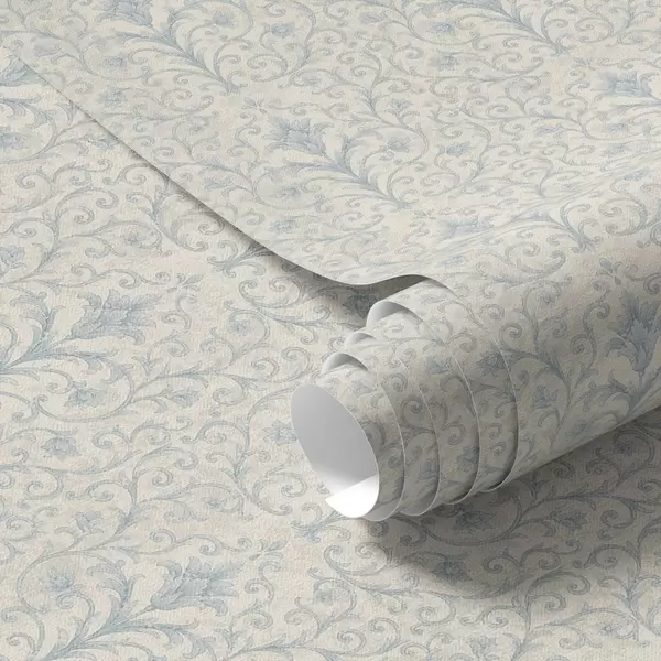 Carta da parati Damasco blu con volute su sfondo color crema Nr. a00578