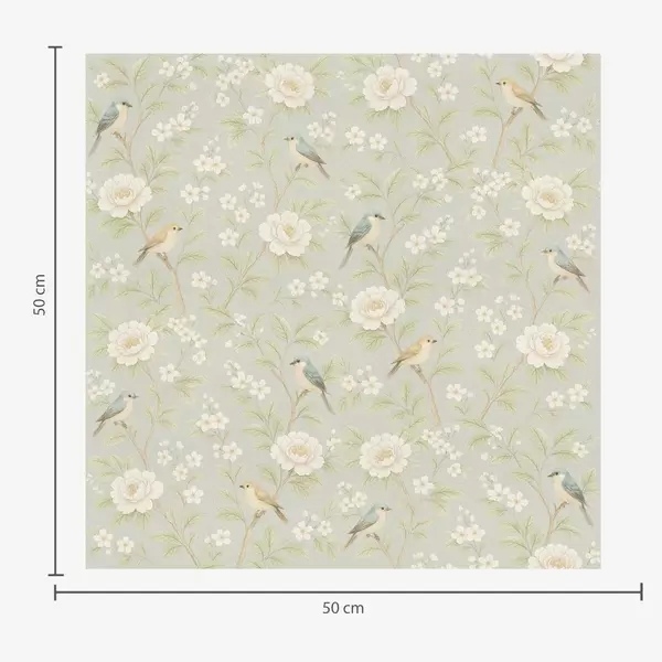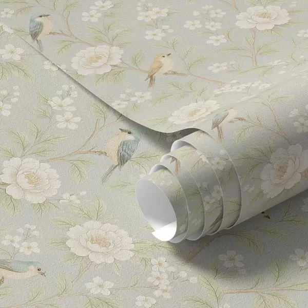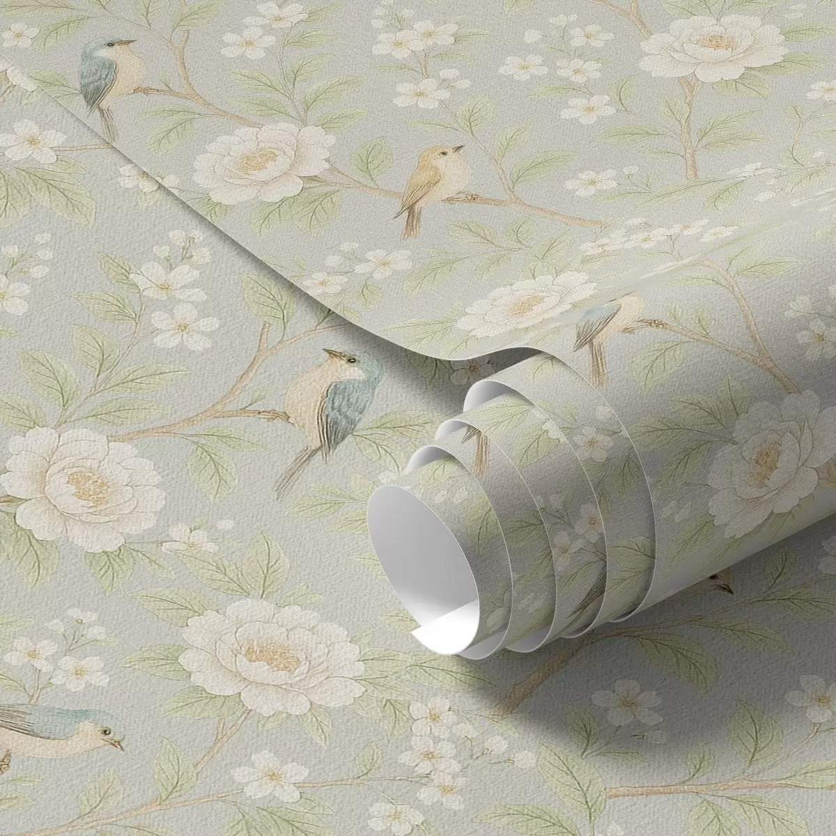 Carta da parati Uccelli tra fiori bianchi su sfondo grigio-verde Nr. a00583