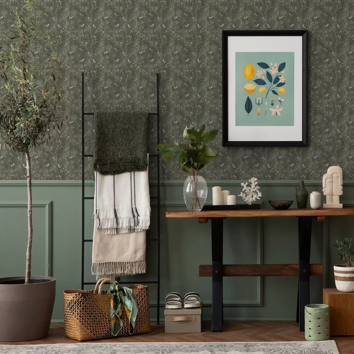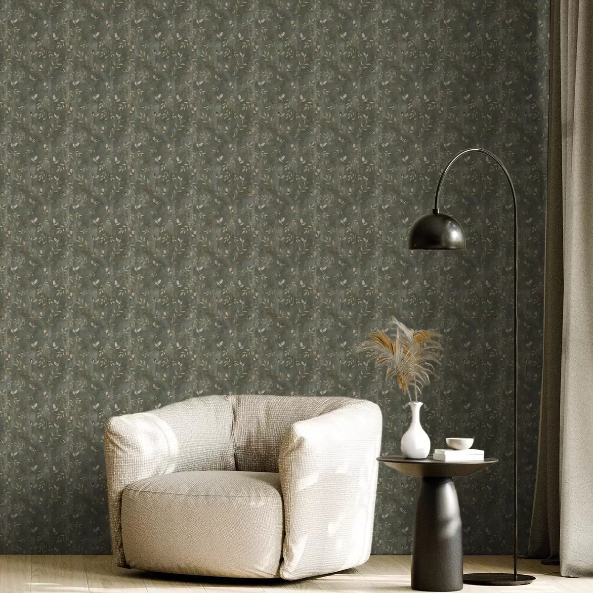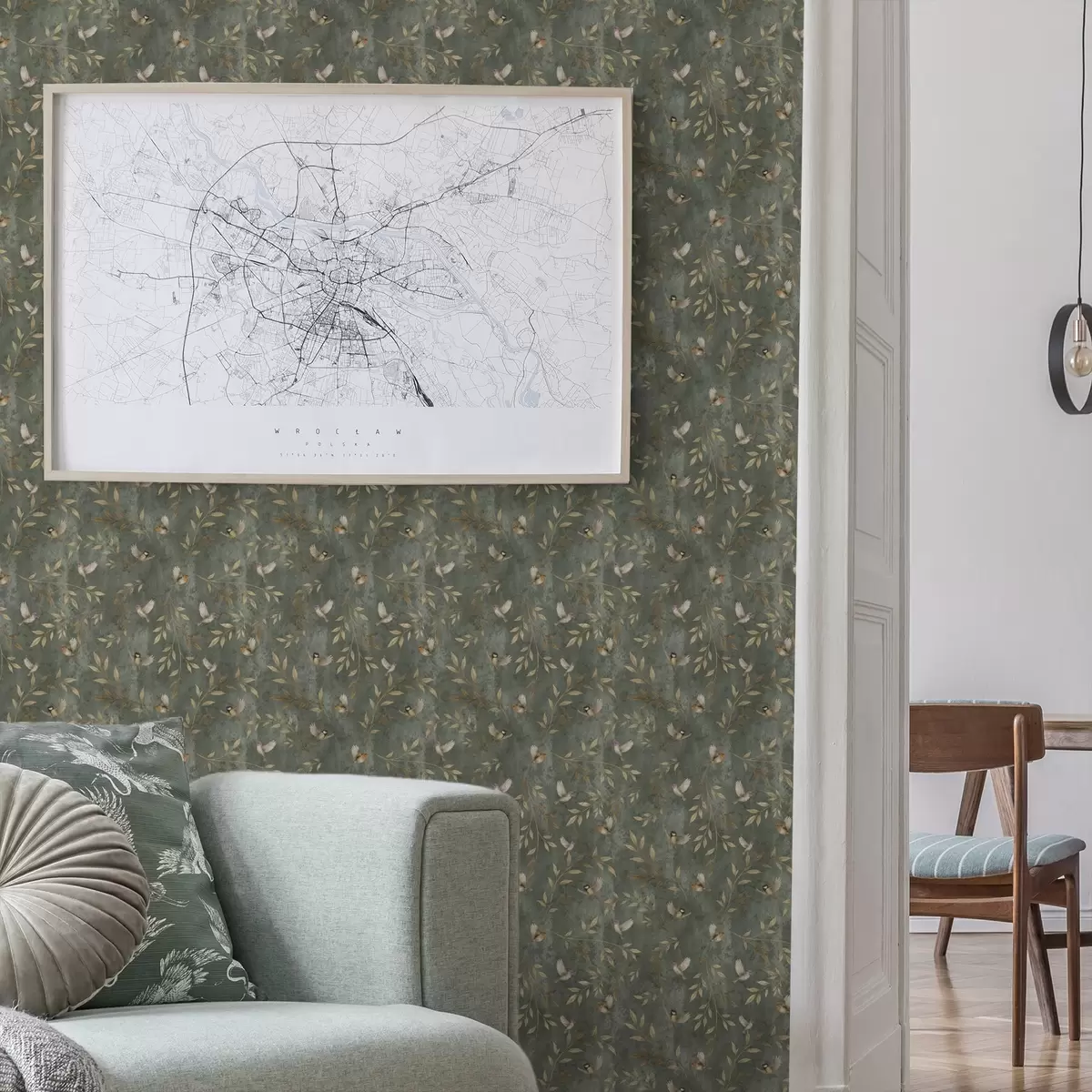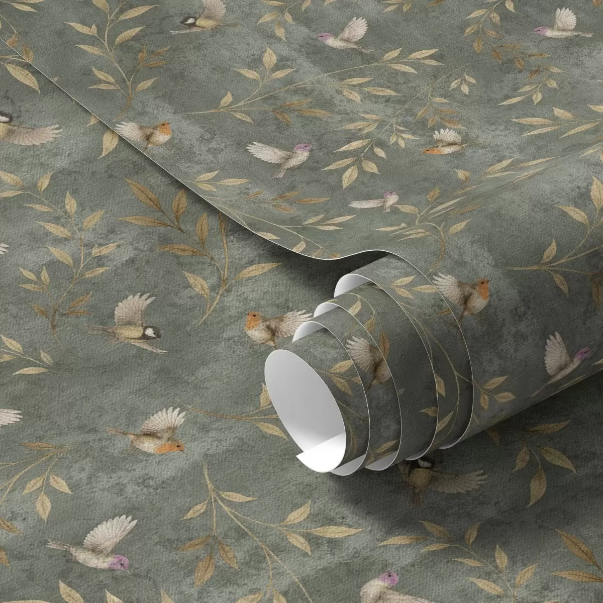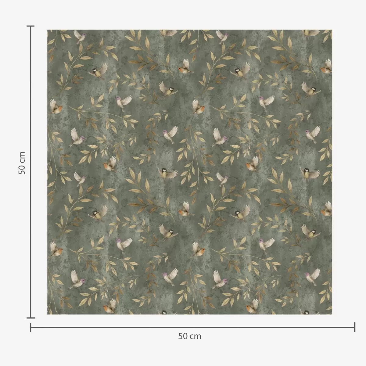 Carta da parati Uccelli tra foglie arancioni su sfondo verde intenso Nr. a00591