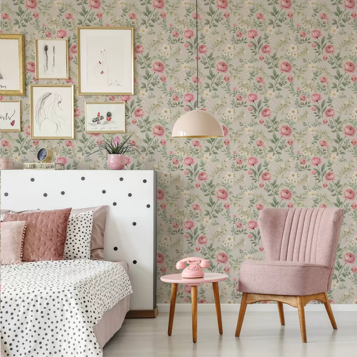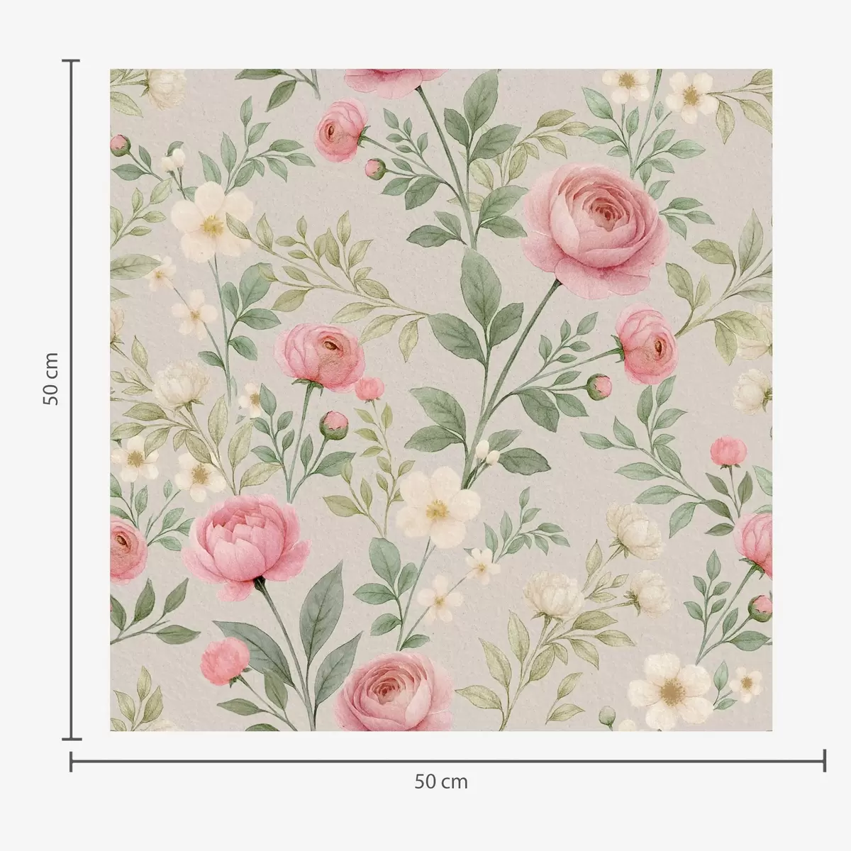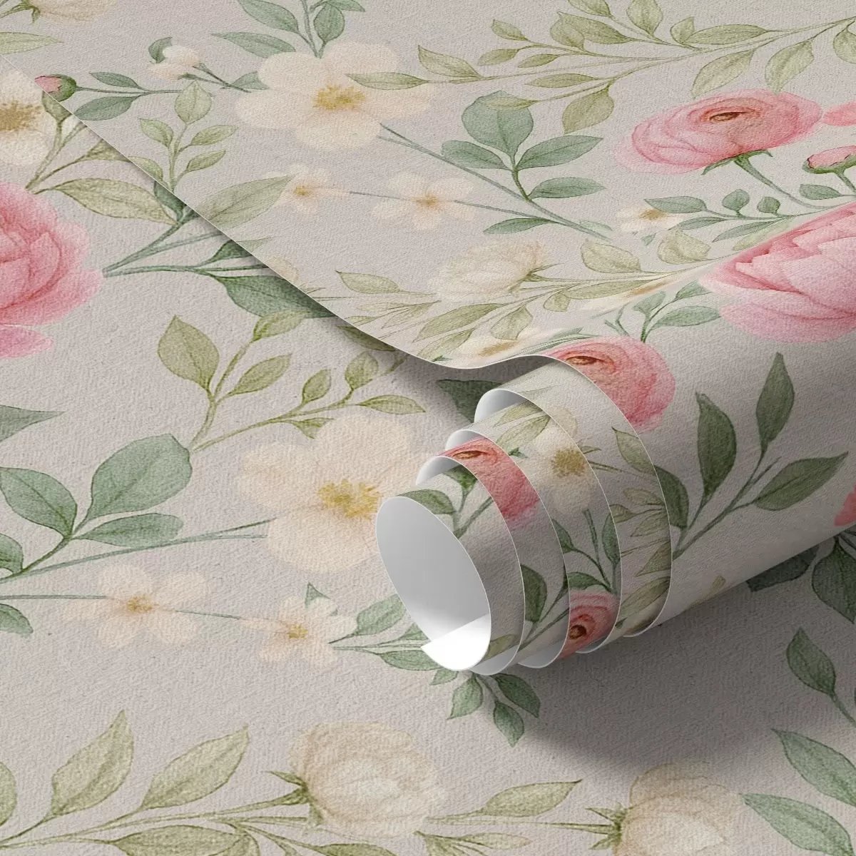 Carta da parati Peonie acquerellate e fiori bianchi su sfondo grigio-beige Nr. a00592