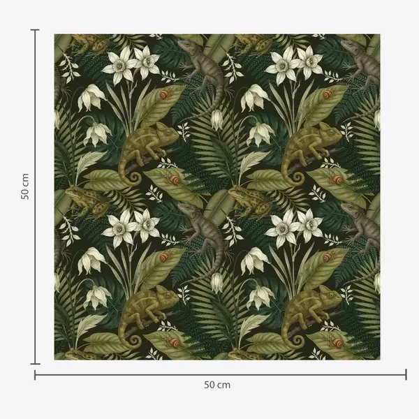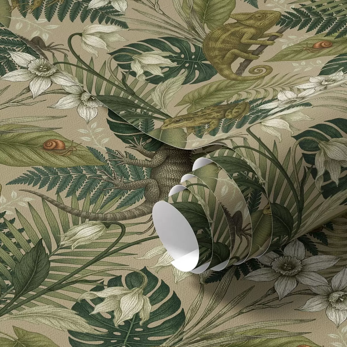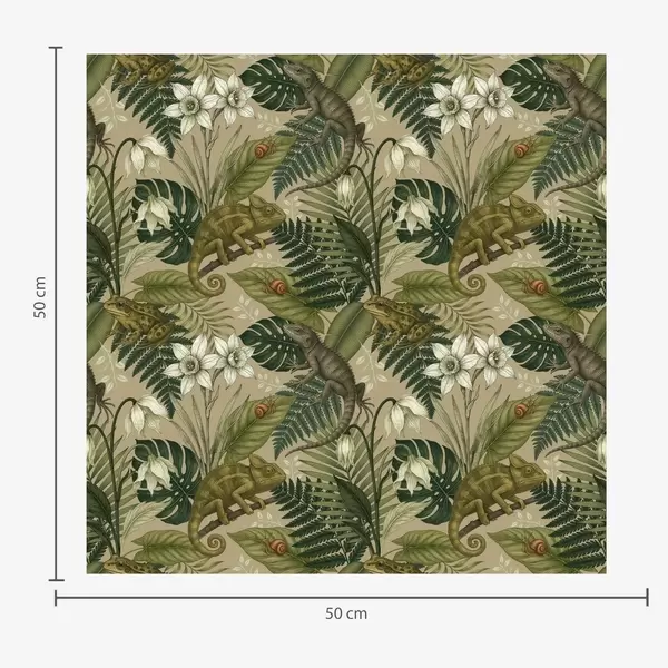 Carta da parati Camaleonti e foglie tropicali, fiori bianchi, sfondo beige Nr. a00608