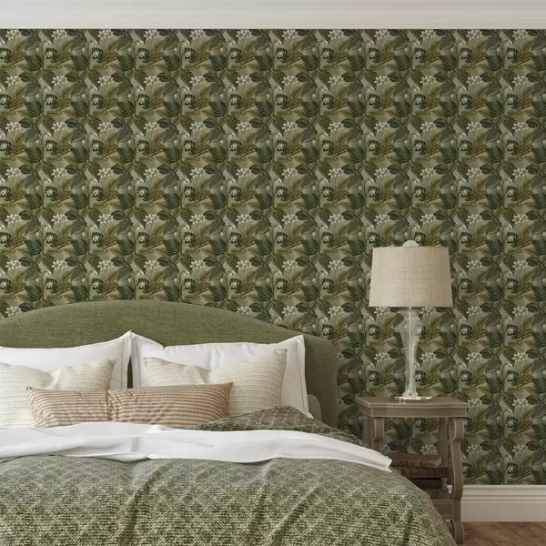 Carta da parati Camaleonti e foglie tropicali, fiori bianchi, sfondo beige a00608