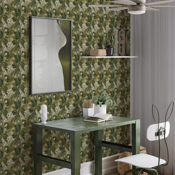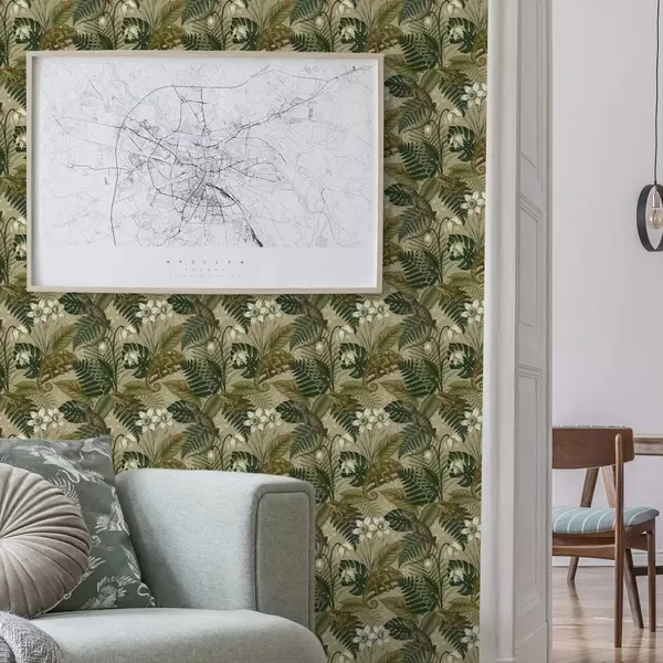 Carta da parati Camaleonti e foglie tropicali, fiori bianchi, sfondo beige Nr. a00608