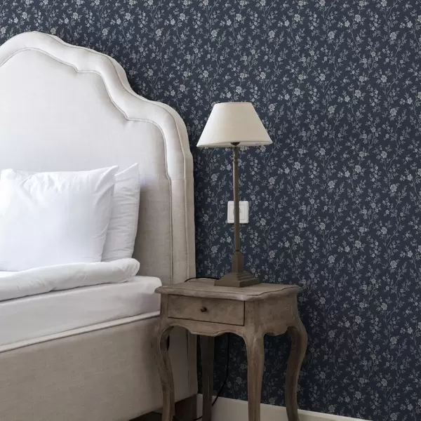 Carta da parati Sfondo blu scuro con sottili rami e fiori beige Nr. a00612