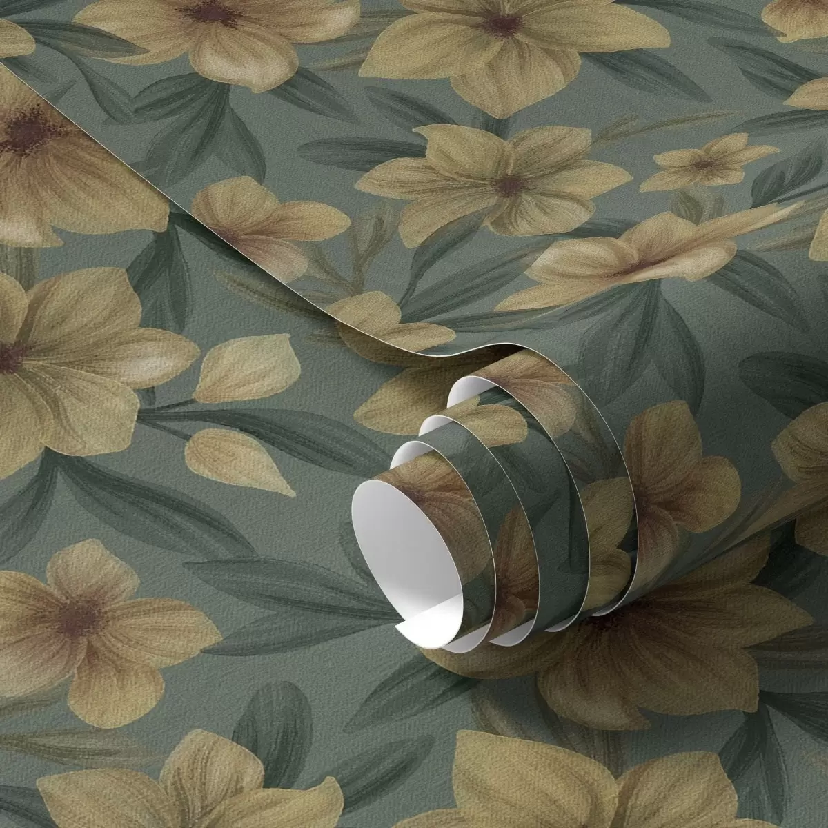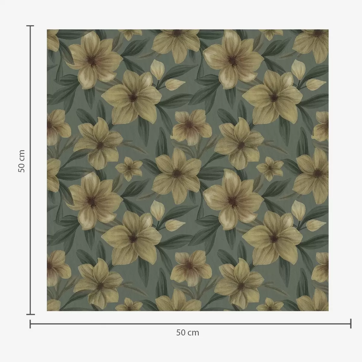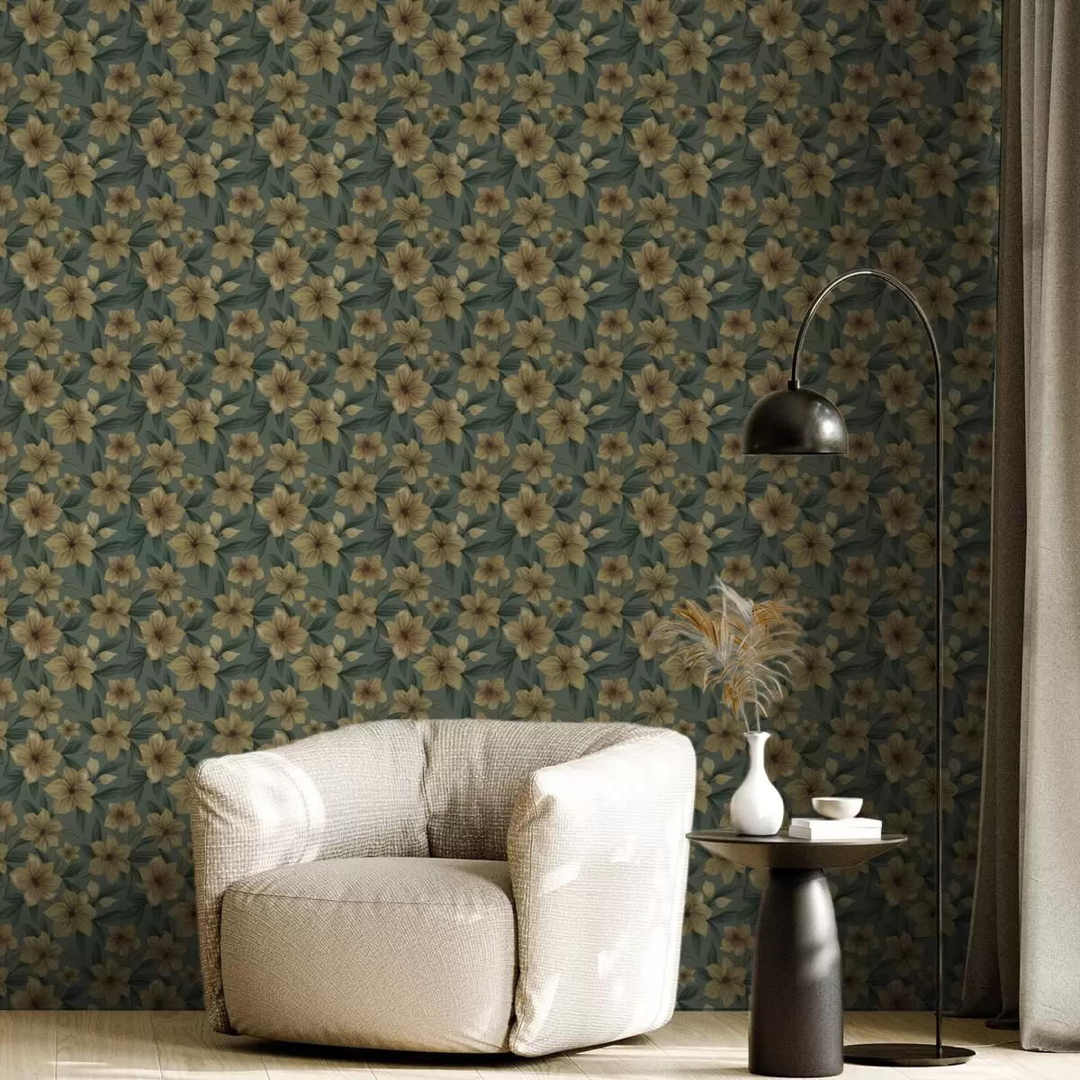 Carta da parati Fiori ocra su sfondo verde intenso, motivo fitto Nr. a00628