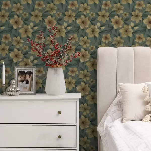 Carta da parati Fiori ocra su sfondo verde intenso, motivo fitto Nr. a00628