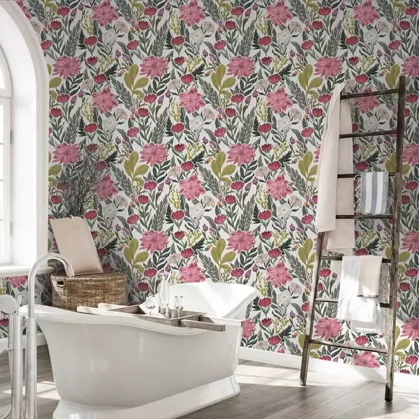 Carta da parati Fiori rosa intenso e crema su sfondo bianco, texture impastata Nr. a00629v1