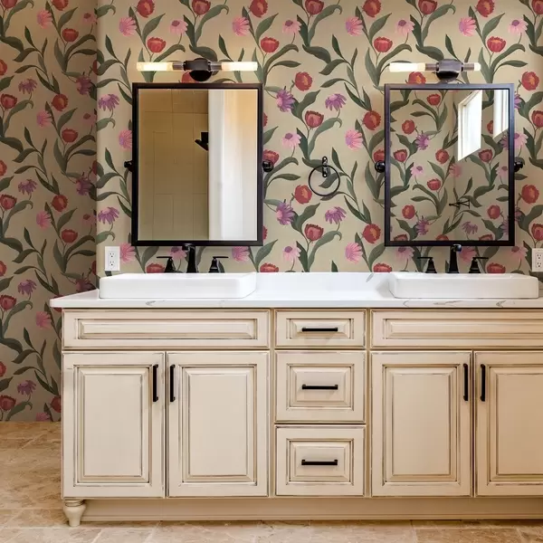 Carta da parati Fiori rosa-rossi su sfondo beige, texture disegnata a mano a00631