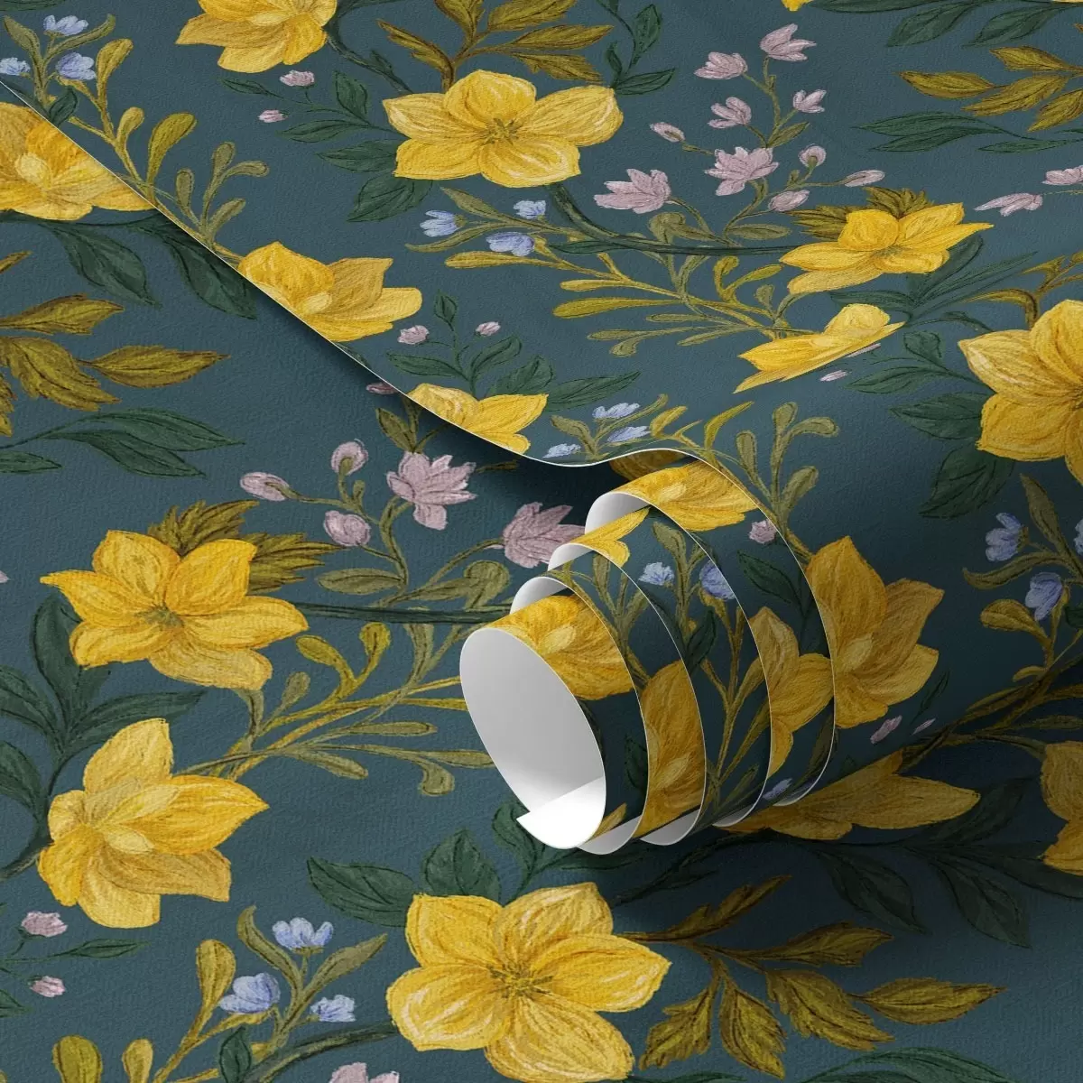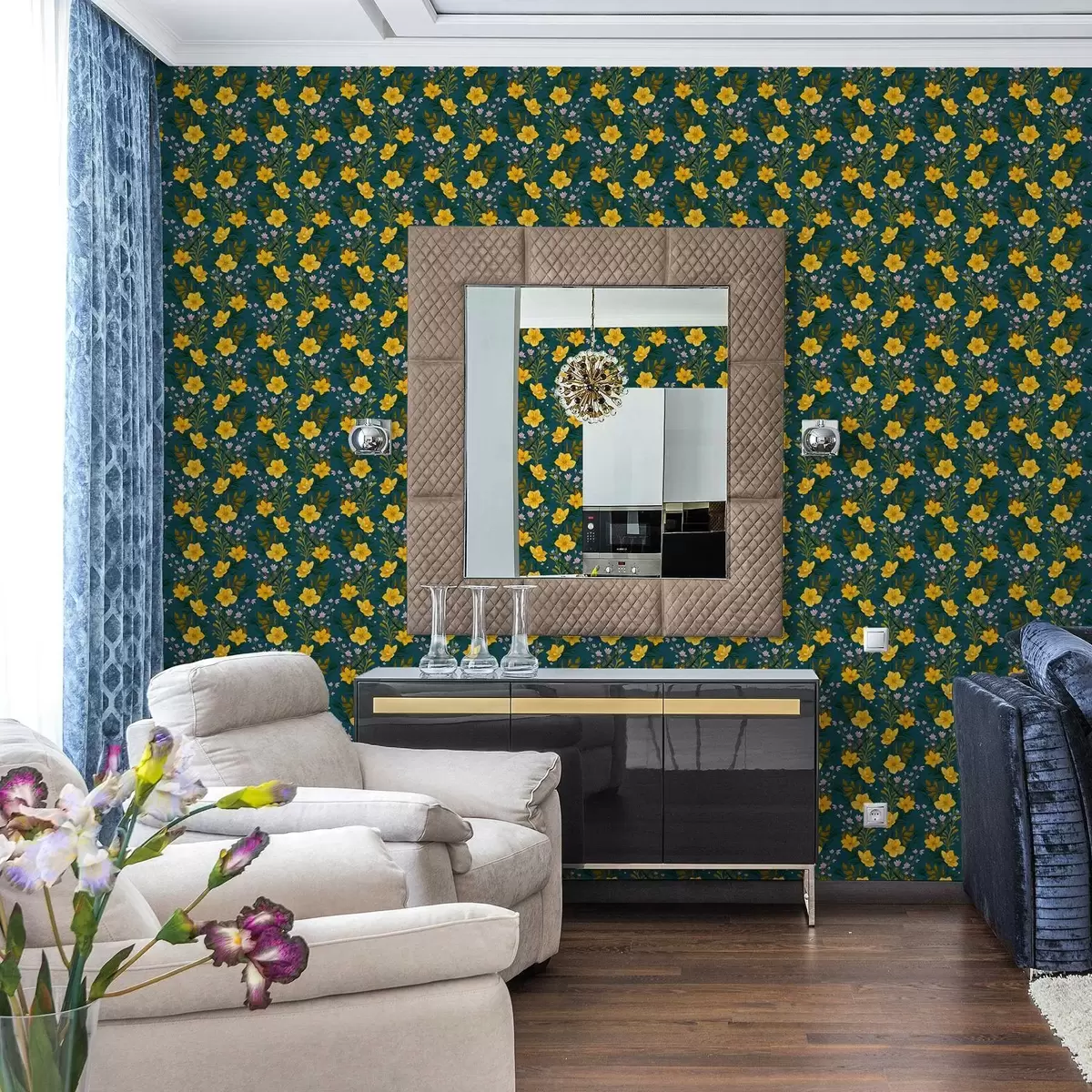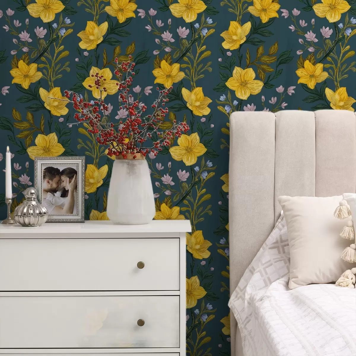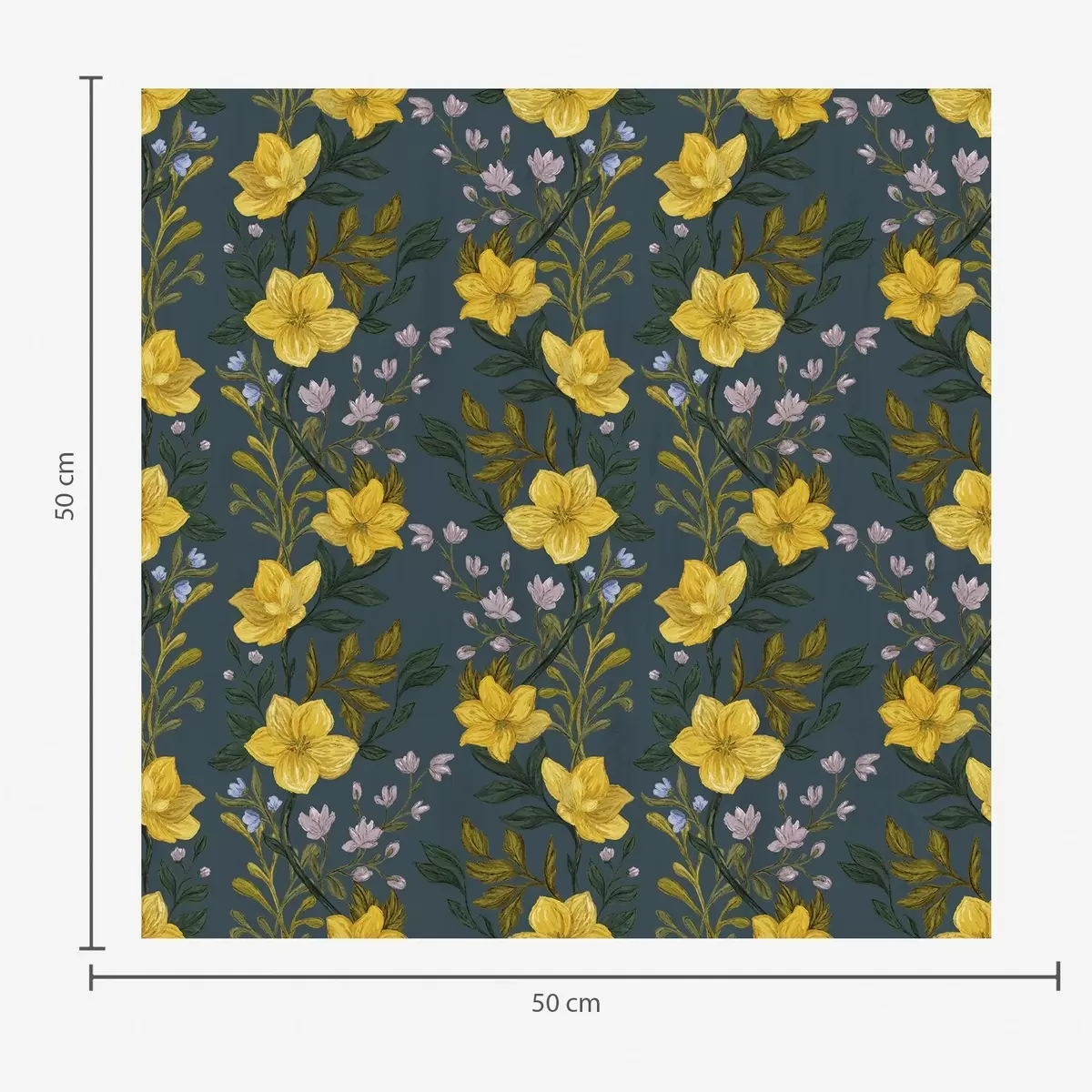 Carta da parati Fiori gialli in ghirlande verticali su sfondo blu scuro Nr. a00632v2